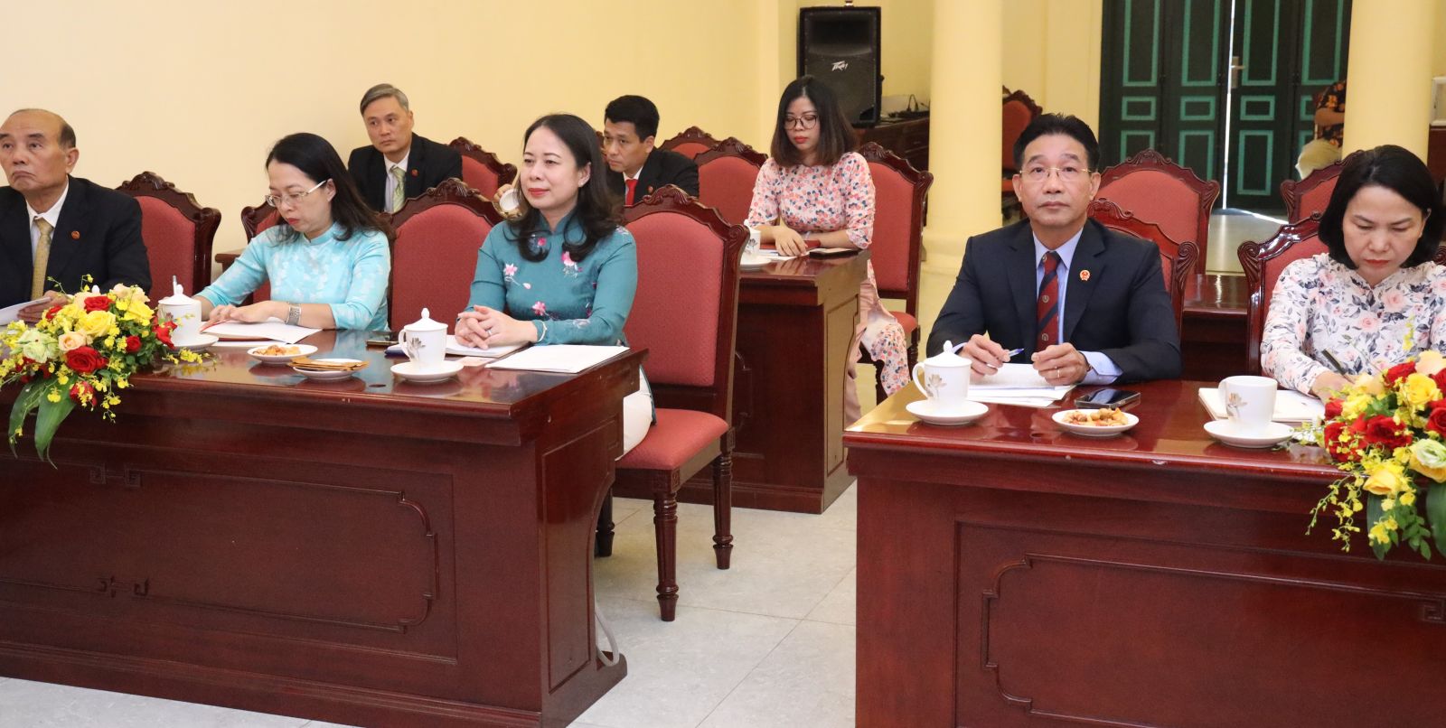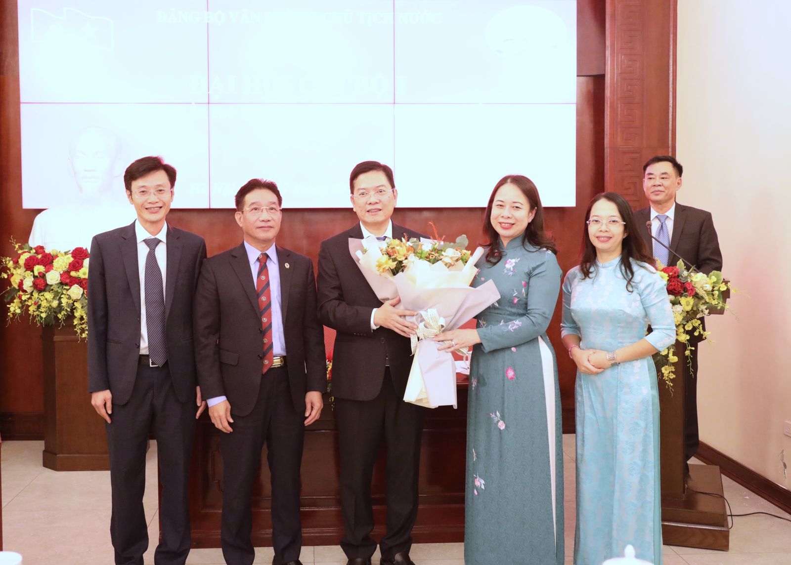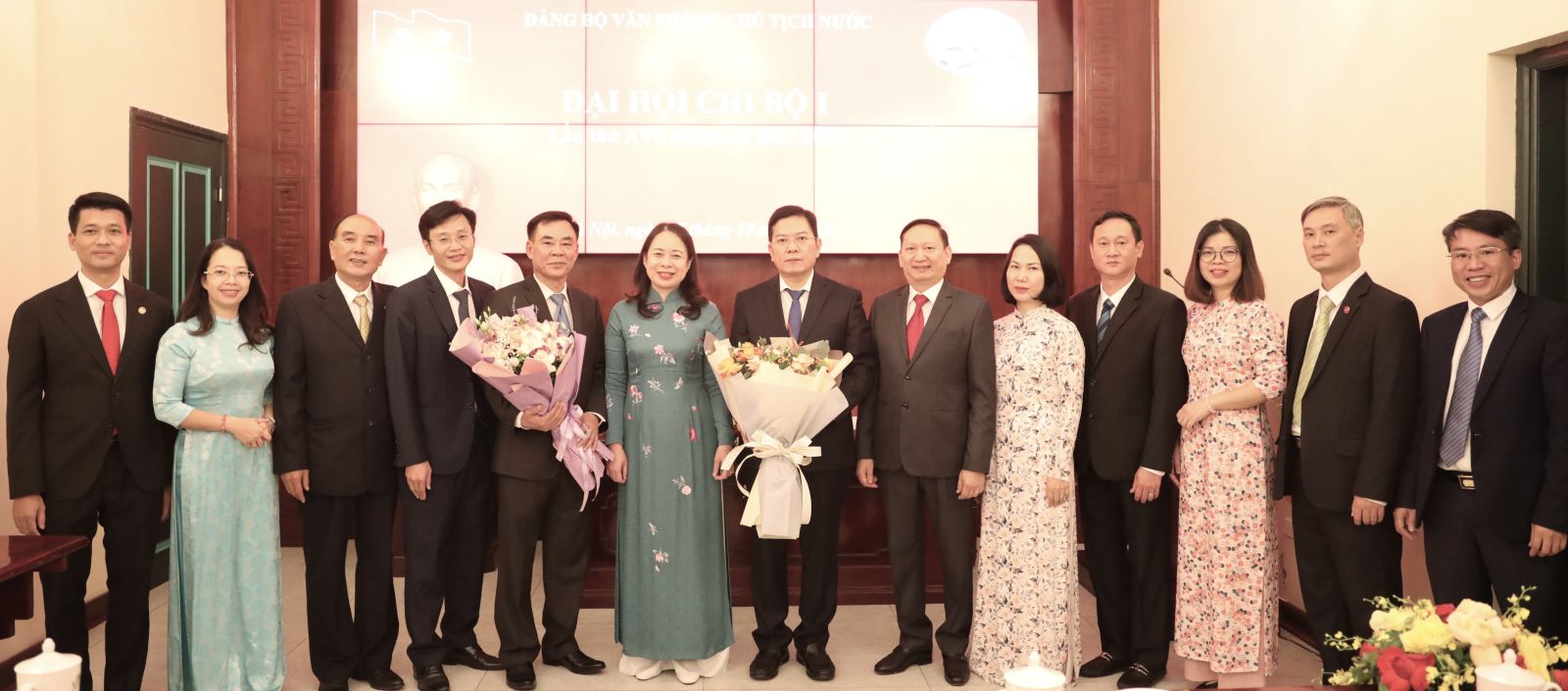 Phó Chủ tịch nước Võ Thị Ánh Xuân và đồng chí Phạm Thanh Hà chúc mừng Chi ủy nhiệm kỳ 2022 - 2025. Ảnh: VPCTN