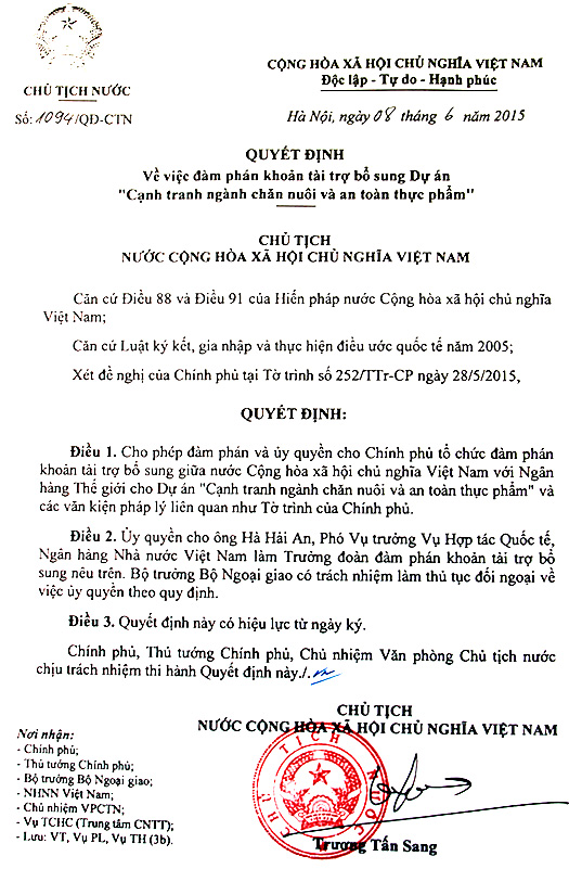 Chủ tịch nước Quyết định về việc đàm phán: khoản tài trợ bổ sung Dự án "Cạnh tranh ngành chăn nuôi và an toàn thực phẩm", Hiệp định Tài trợ cho Dự án "Hỗ trợ đổi mới giáo dục phổ thông" và Hiệp định Tài trợ cho Dự án "Chuyển đổi nông nghiệp bền vững tại Việt Nam"