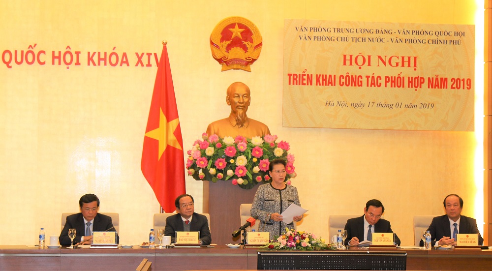 Chủ tịch Quốc hội nhấn mạnh năm 2019 là năm có nhiều sự kiện quan trọng của đất nước, như: tổng kết 5 năm triển khai thi hành Hiến pháp; tổng kết thí điểm hợp nhất ba Văn phòng cấp tỉnh; triển khai các nội dung chuẩn bị Đại hội Đảng bộ các cấp tiến tới Đại hội Đảng toàn quốc lần thứ XIII, trong đó có triển khai Nghị quyết Hội nghị Trung ương 9 về quy hoạch Ban Chấp hành Trung ương Đảng nhiệm kỳ 2021-2026; đồng thời là năm bứt phá để hoàn thành kế hoạch 5 năm (2016-2020) theo Nghị quyết Đại hội đề ra…