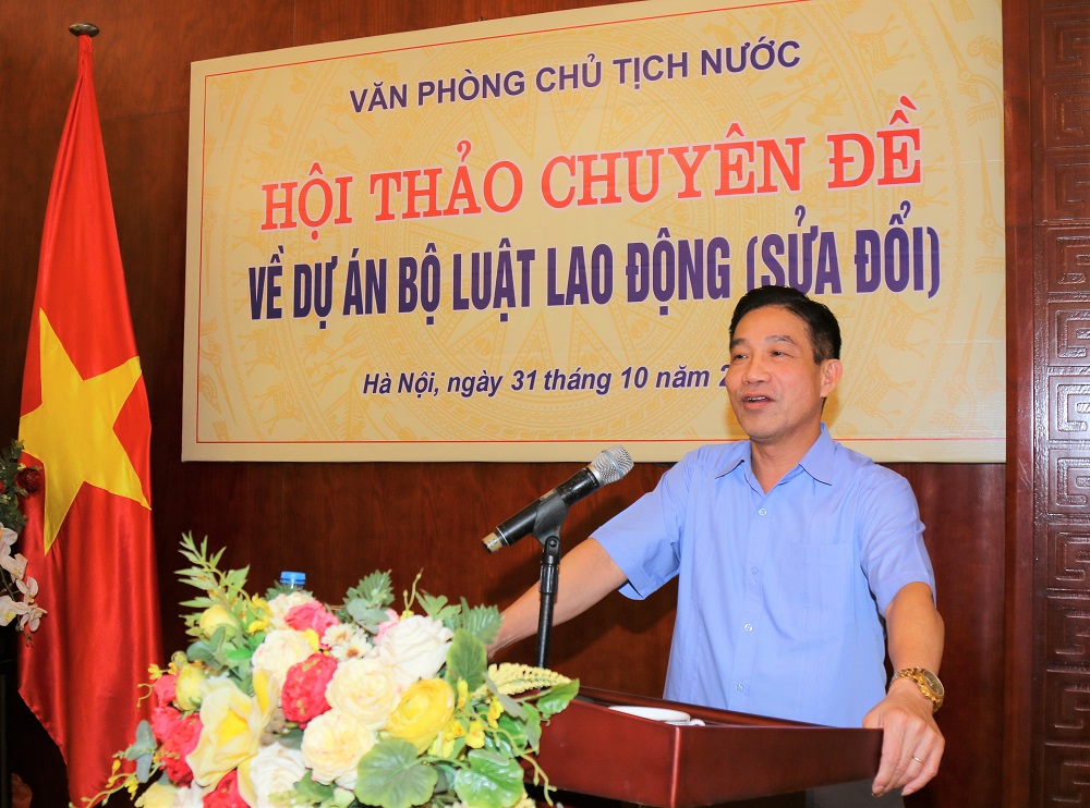 Chiều 31-10-2019, tại Hà Nội, Văn phòng Chủ tịch nước đã tổ chức Hội thảo chuyên đề về Dự án Bộ luật Lao động (sửa đổi). Phó Chủ nhiệm Văn phòng Chủ tịch nước Phạm Thanh Hà chủ trì Hội thảo.