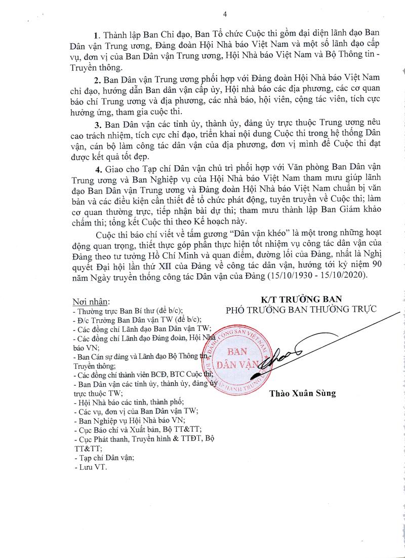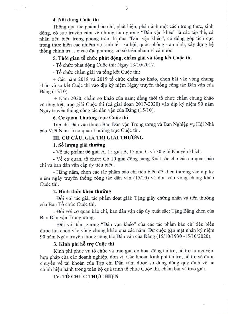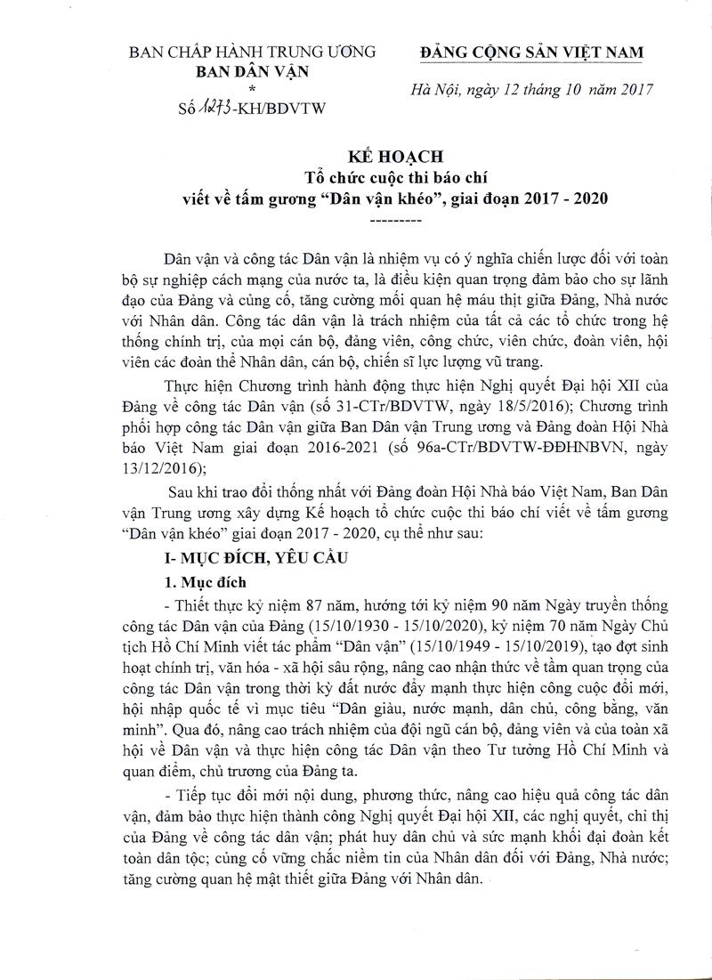 Cuộc thi báo chí viết về tấm gương “Dân vận khéo” được Ban Dân vận Trung ương phối hợp với Đảng đoàn Hội Nhà báo Việt Nam phát động từ 13/10/2017. Đây là hoạt động hướng tới Kỷ niệm 90 năm Ngày truyền thống công tác Dân vận của Đảng.