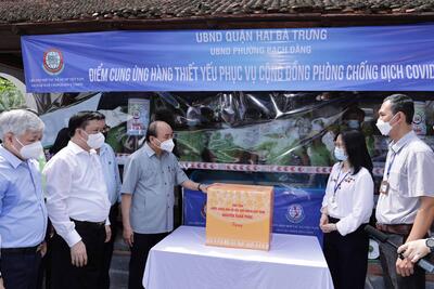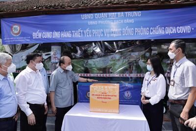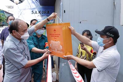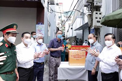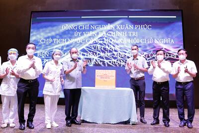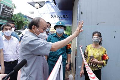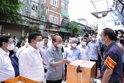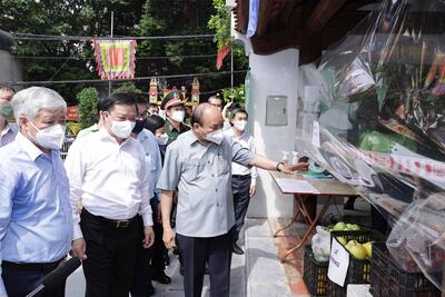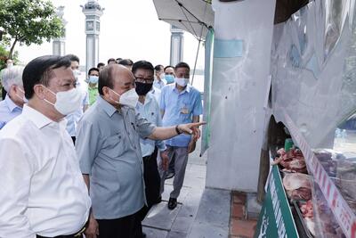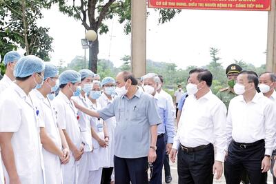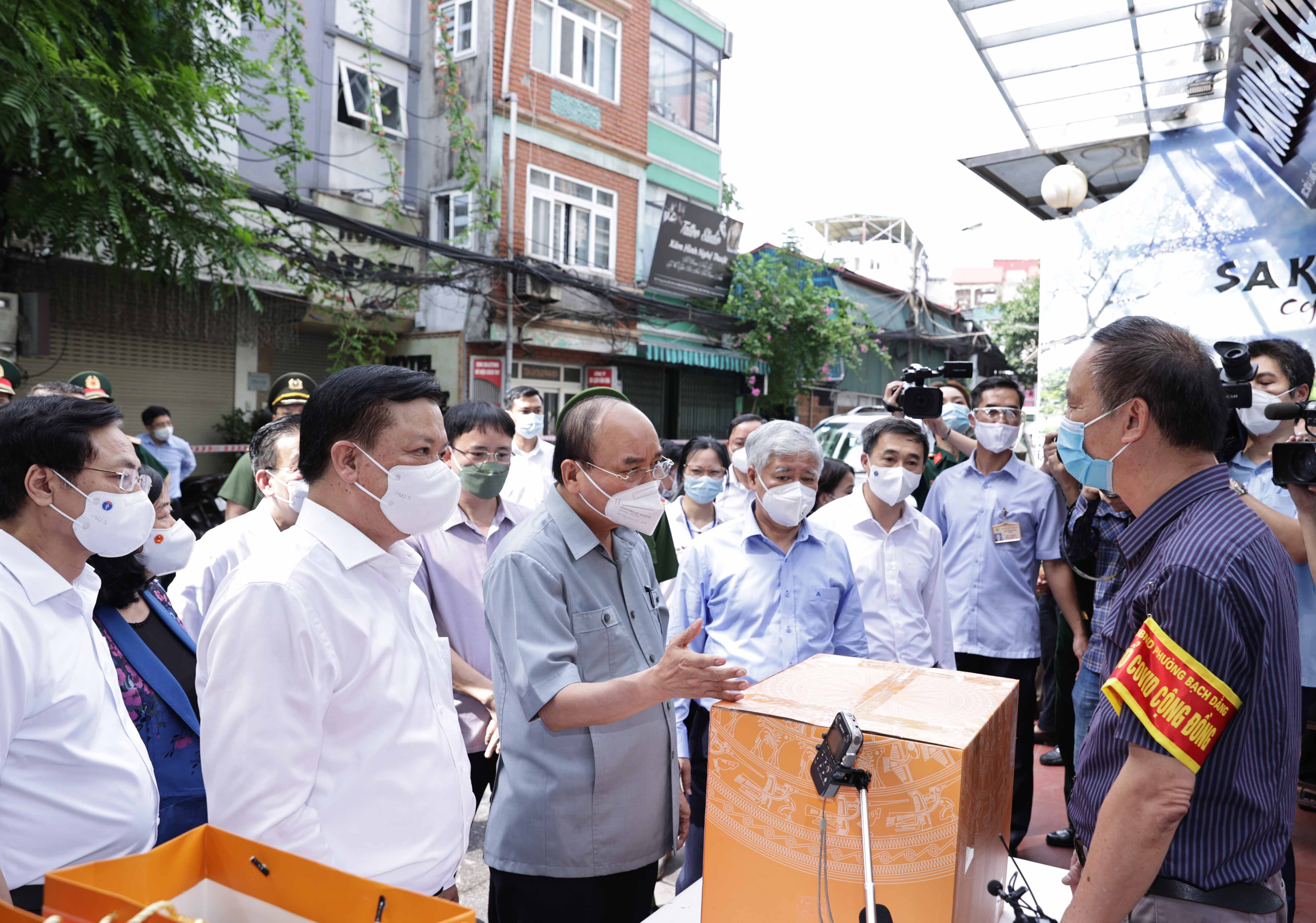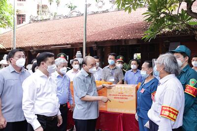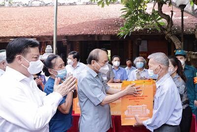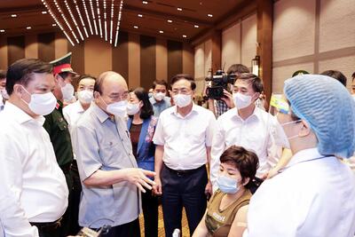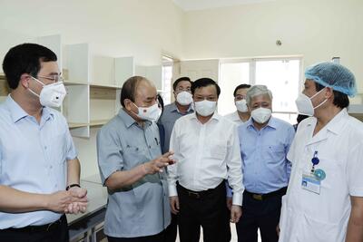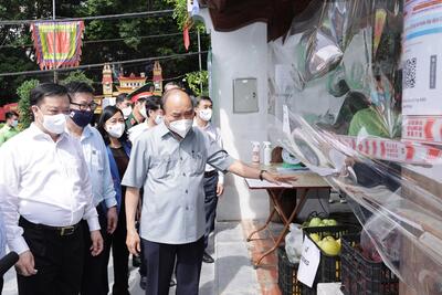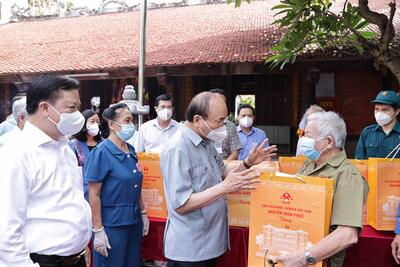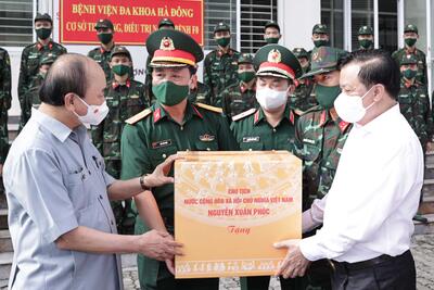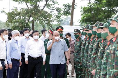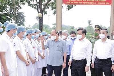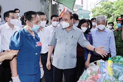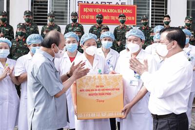 Sáng 13/8/2021, Chủ tịch nước Nguyễn Xuân Phúc đến thăm, động viên cán bộ, chiến sỹ, nhân viên y tế cơ sở thu dung, điều trị bệnh nhân mắc COVID-19 và các khu dân cư thực hiện tốt “Vùng xanh” trên địa bàn Thủ đô Hà Nội