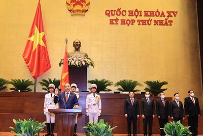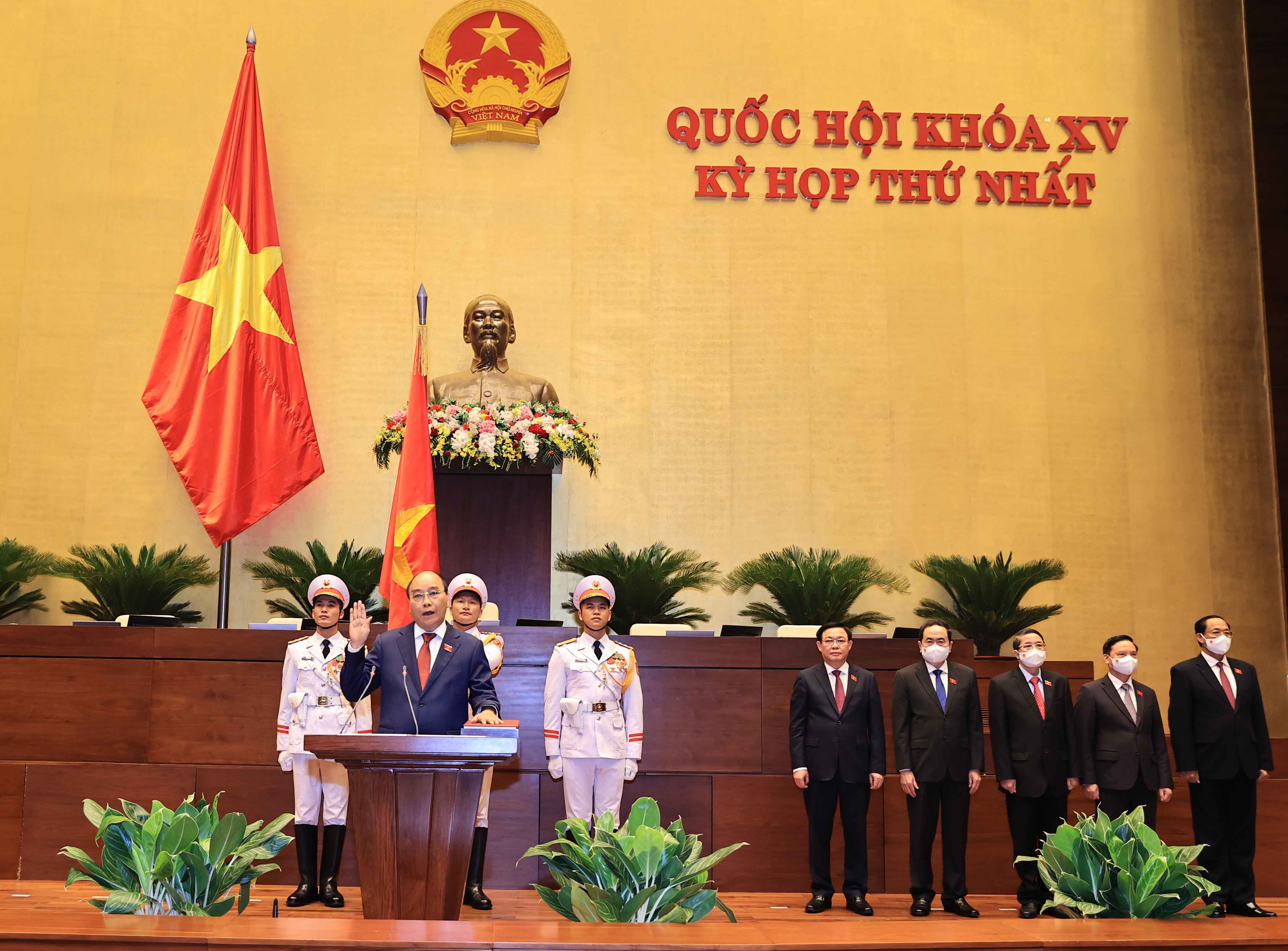 Sáng 26/7, tại Nhà Quốc hội, với sự điều hành của Chủ tịch Quốc hội khóa XV Vương Đình Huệ, Quốc hội đã thảo luận, biểu quyết thông qua danh sách để Quốc hội bầu Chủ tịch nước. Quốc hội đã bầu đồng chí Nguyễn Xuân Phúc, Ủy viên Bộ Chính trị, Chủ tịch nước nhiệm kỳ 2016-2021, giữ chức Chủ tịch nước nhiệm kỳ 2021-2026. VPCTN trân trọng giới thiệu một số hình ảnh tuyên thệ nhậm chức của Chủ tịch nước Nguyễn Xuân Phúc: