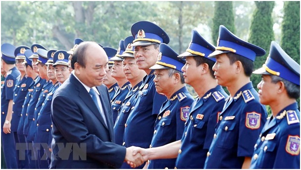 Thủ tướng Nguyễn Xuân Phúc với các cán bộ, sỹ quan chỉ huy của Bộ Tư lệnh Cảnh sát biển Việt Nam. (Ảnh: Thống Nhất/TTXVN)