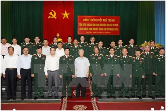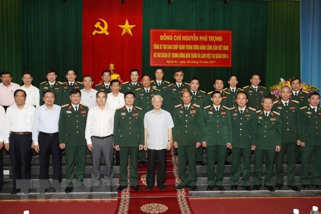 Tổng Bí thư nhấn mạnh, Quân khu 4 có vị trí chiến lược quan trọng, cả trước mắt và lâu dài, đóng quân trên địa bàn 6 tỉnh, dải đất miền Trung gian lao mà anh dũng, có nhiều cống hiến, hy sinh trong sự nghiệp đấu tranh giành độc lập tự do cho Tổ quốc.