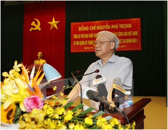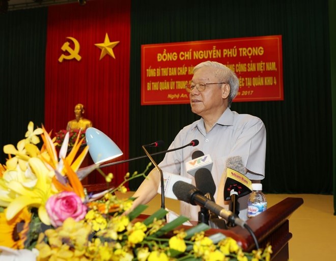 Tổng Bí thư Nguyễn Phú Trọng phát biểu tại Bộ Tư lệnh Quân khu 4. (Ảnh: Trí Dũng/TTXVN)