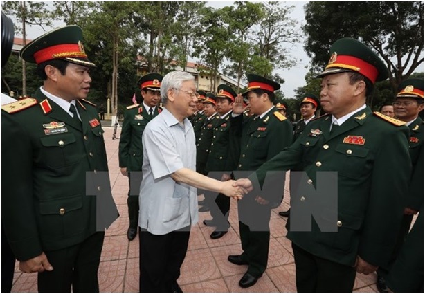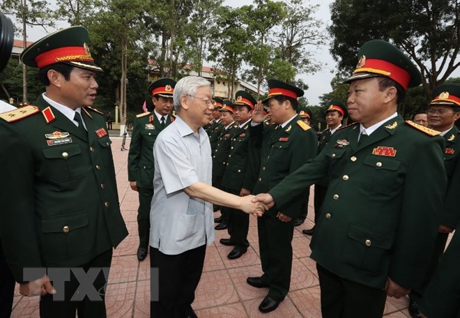 Tổng Bí thư Nguyễn Phú Trọng với cán bộ, chỉ huy Bộ Tư lệnh Quân khu 4. (Ảnh: Trí Dũng/TTXVN)
