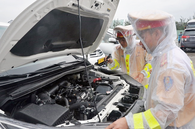 Việc dầm mưa không chỉ với những CSGT làm nhiệm vụ trên đường, tại điểm hội nghị, mà để phục vụ chu đáo TLCC, lực lượng kiểm định phương tiện thuộc Cục CSGT cũng phải làm việc hết mình trong mưa bão.