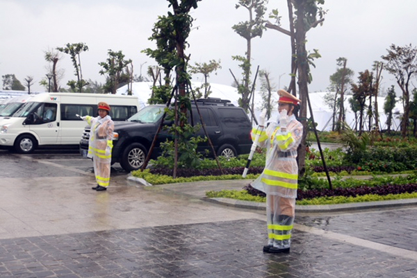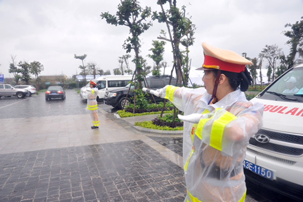 Do ảnh hưởng của bão, hơn 30 chuyến bay quốc nội của Việt Nam Airline và Vietjet Air đi Đà Nẵng và các tỉnh miền Trung buộc phải hủy. Tuy nhiên, vẫn có một số chuyến bay chở quan chức, đại biểu dự TLCC APEC hạ cánh. Với nhiệm vụ đón, dẫn đoàn về các khách sạn và nơi tổ chức hội nghị, các xe ô tô và mô tô dẫn đường của CSGT lại lên đường.