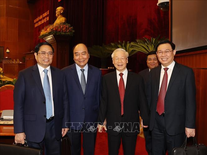 Tổng Bí thư Nguyễn Phú Trọng, Chủ tịch nước Nguyễn Xuân Phúc, Thủ tướng Chính phủ Phạm Minh Chính, Chủ tịch Quốc hội Vương Đình Huệ dự bế mạc Hội nghị. Ảnh: Trí Dũng/TTXVN