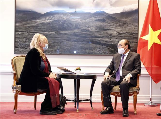 Chủ tịch nước Nguyễn Xuân Phúc tiếp bà Sandra Scagliotti, Lãnh sự danh dự Việt Nam tại Torino (Italy). Ảnh: Thống Nhất/TTXVN