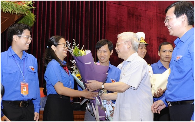 Tổng Bí thư, Chủ tịch nước Nguyễn Phú Trọng gặp mặt các đảng viên trẻ tiêu biểu toàn quốc học tập và làm theo lời Bác (8/2019). (Ảnh: TTXVN)
