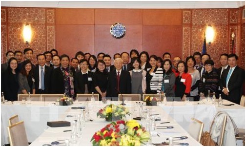 Tổng Bí thư Nguyễn Phú Trọng gặp gỡ đại biểu trí thức trẻ Việt Nam tại Cộng hòa Pháp. (Ảnh: TTXVN)