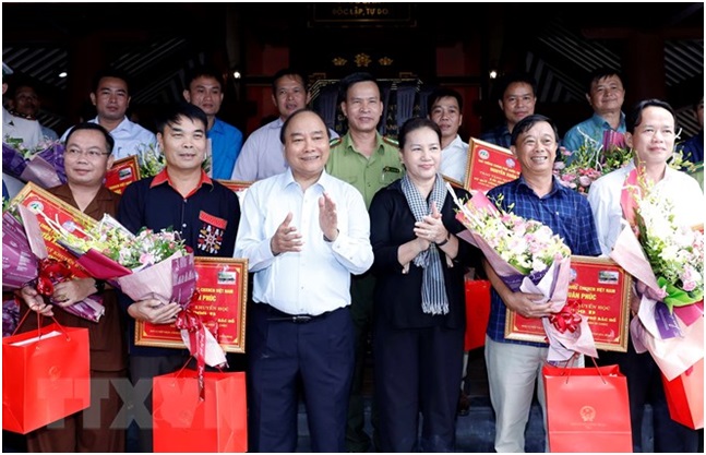 Thủ tướng Nguyễn Xuân Phúc, Chủ tịch Quốc hội Nguyễn Thị Kim Ngân tặng học bổng khuyến học cho học sinh 16 xã vùng đệm của Vườn quốc gia Ba Vì, thành phố Hà Nội. (Ảnh: Thống Nhất/TTXVN)