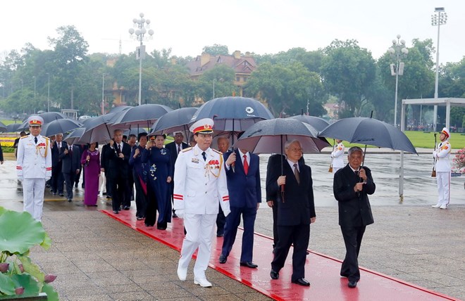 Đoàn lãnh đạo Đảng, Nhà nước, Quốc hội, Chính phủ, Ủy ban Trung ương Mặt trận Tổ quốc Việt Nam đặt vòng hoa và vào Lăng viếng Chủ tịch Hồ Chí Minh. (Ảnh: Văn Điệp/TTXVN)
