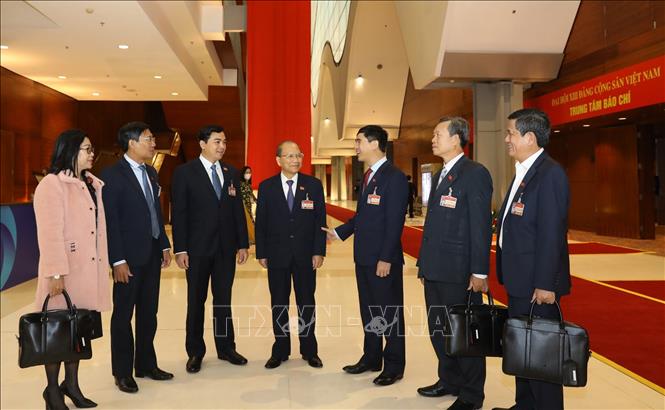 Đoàn đại biểu Đảng bộ tỉnh Ninh Thuận trước giờ làm việc sáng 29/1. Ảnh: TTXVN
