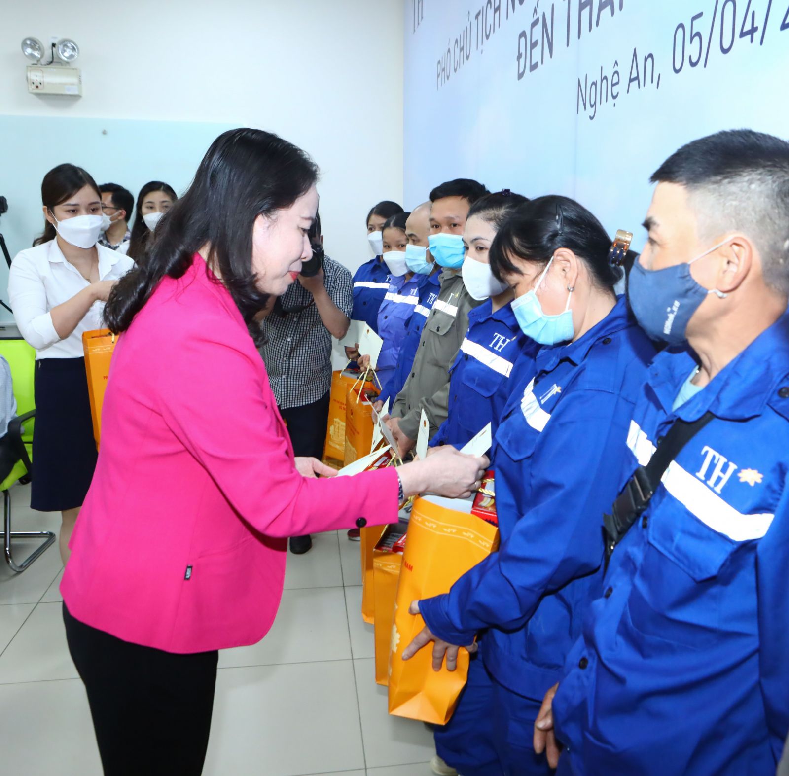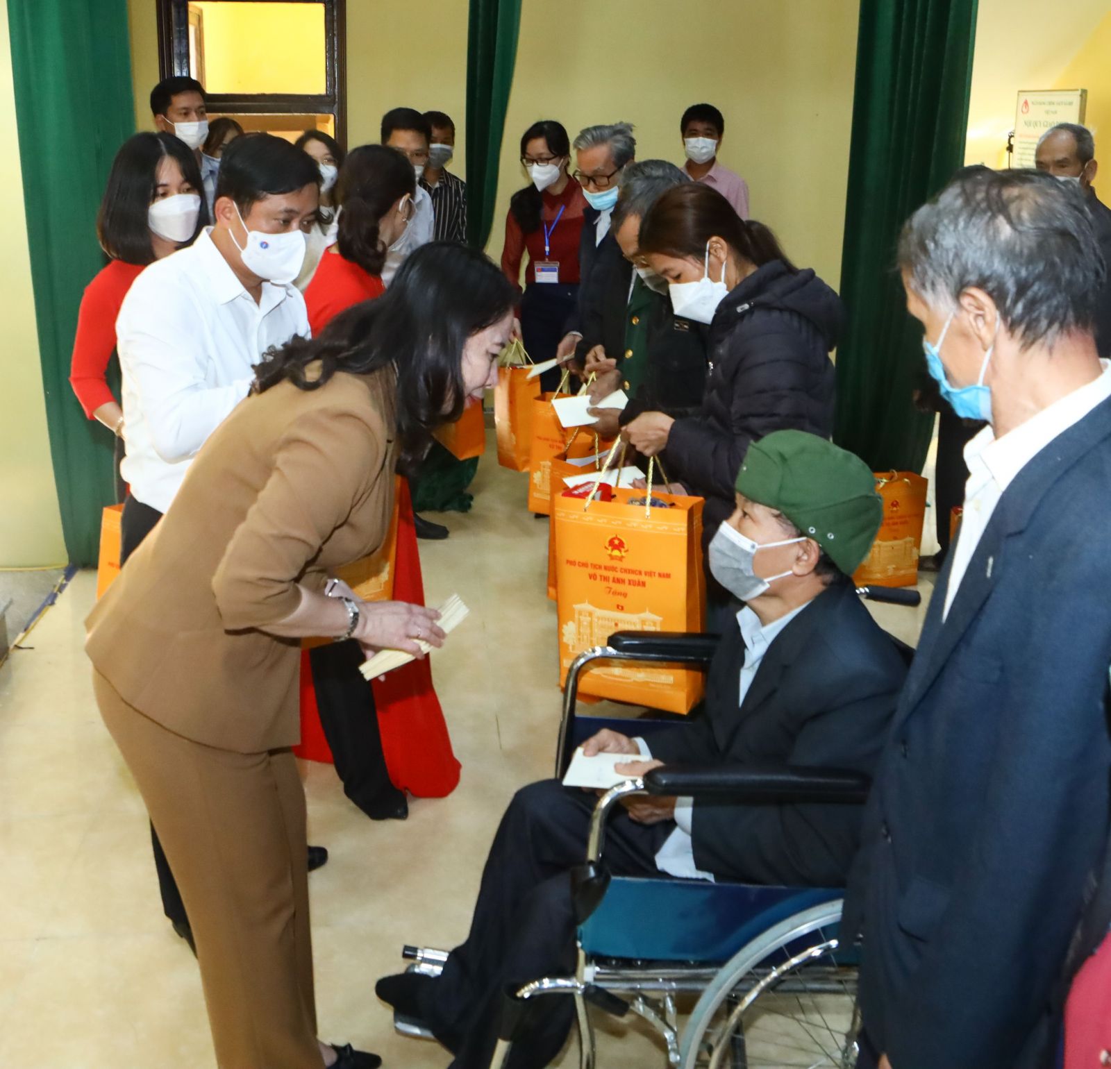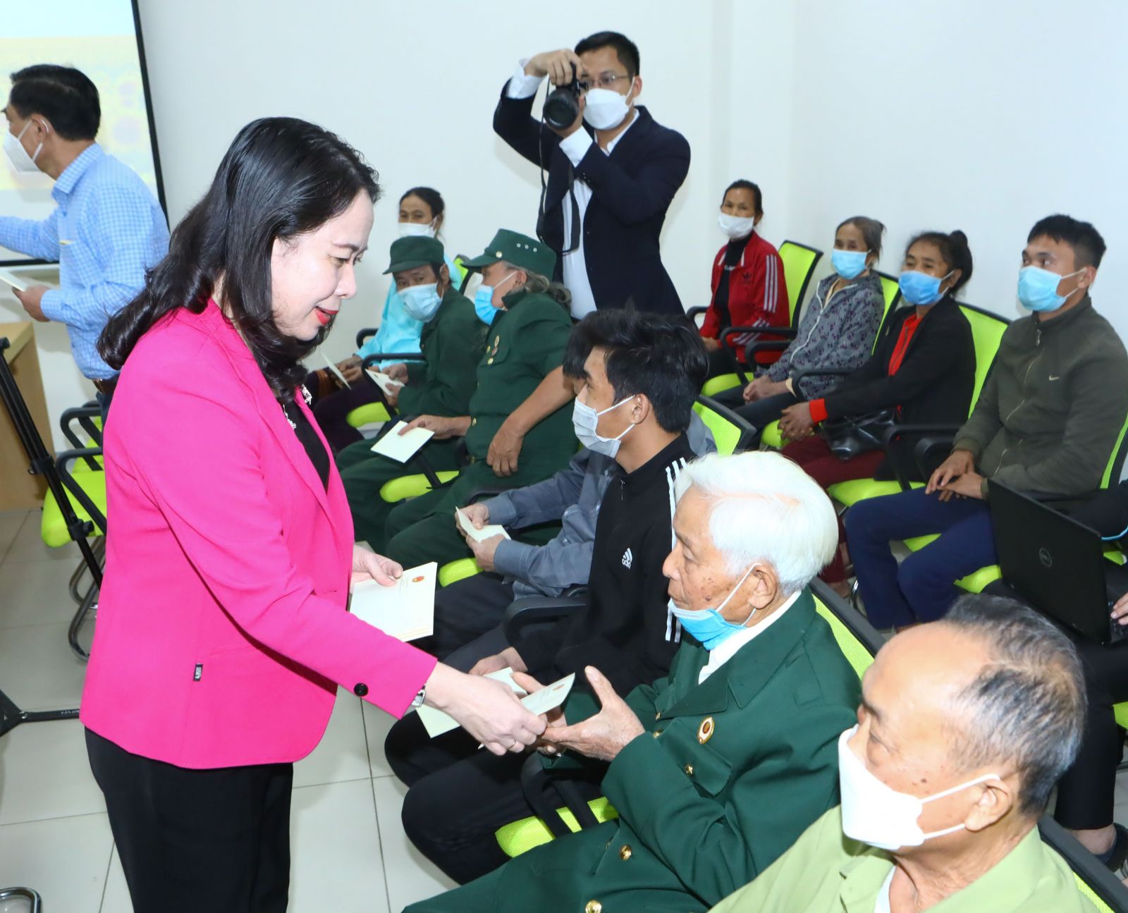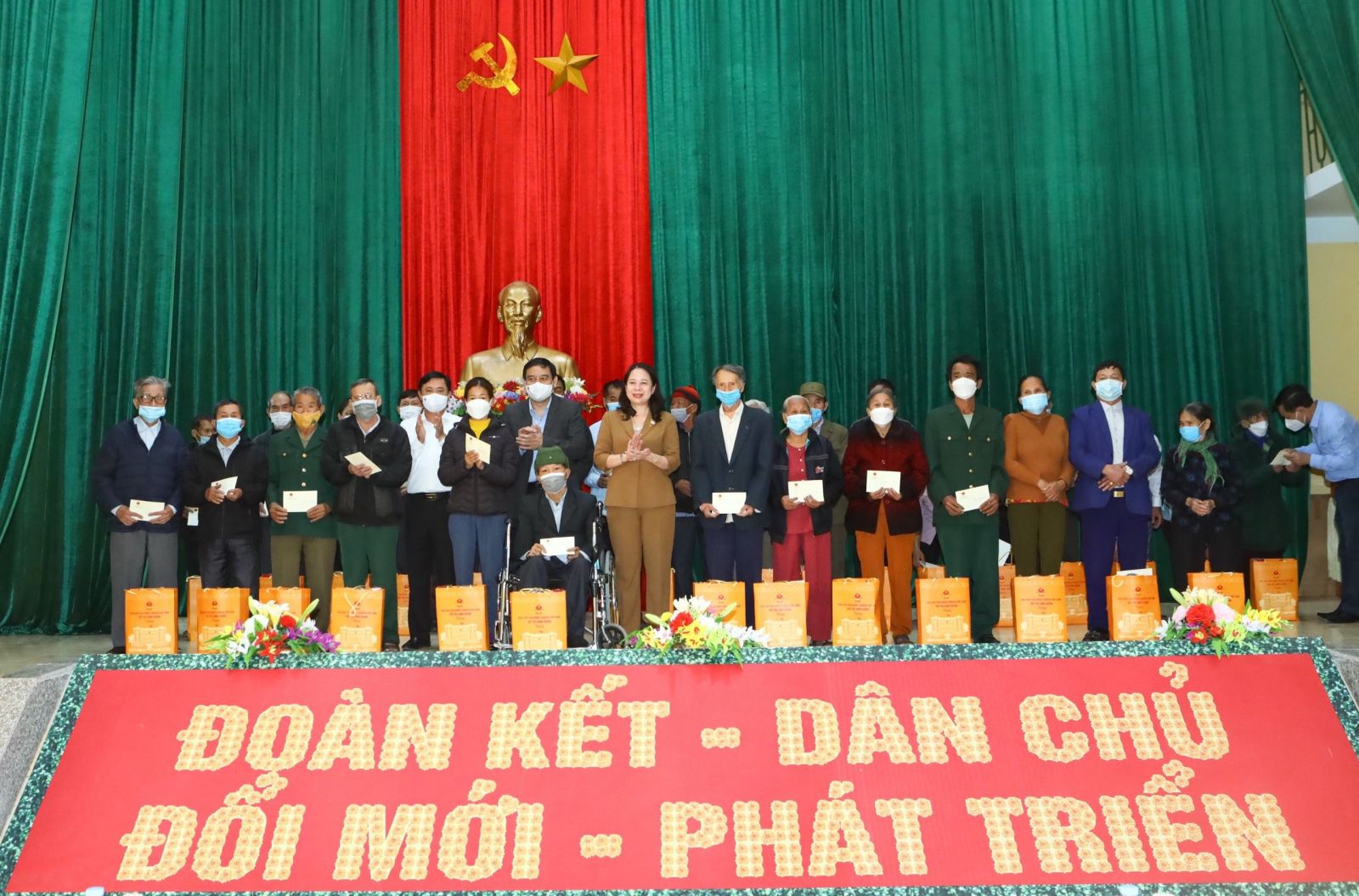 Phó Chủ tịch nước Võ Thị Ánh Xuân tặng quà cho các gia đình chính sách huyện Nghĩa Đàn. Ảnh: VPCTN