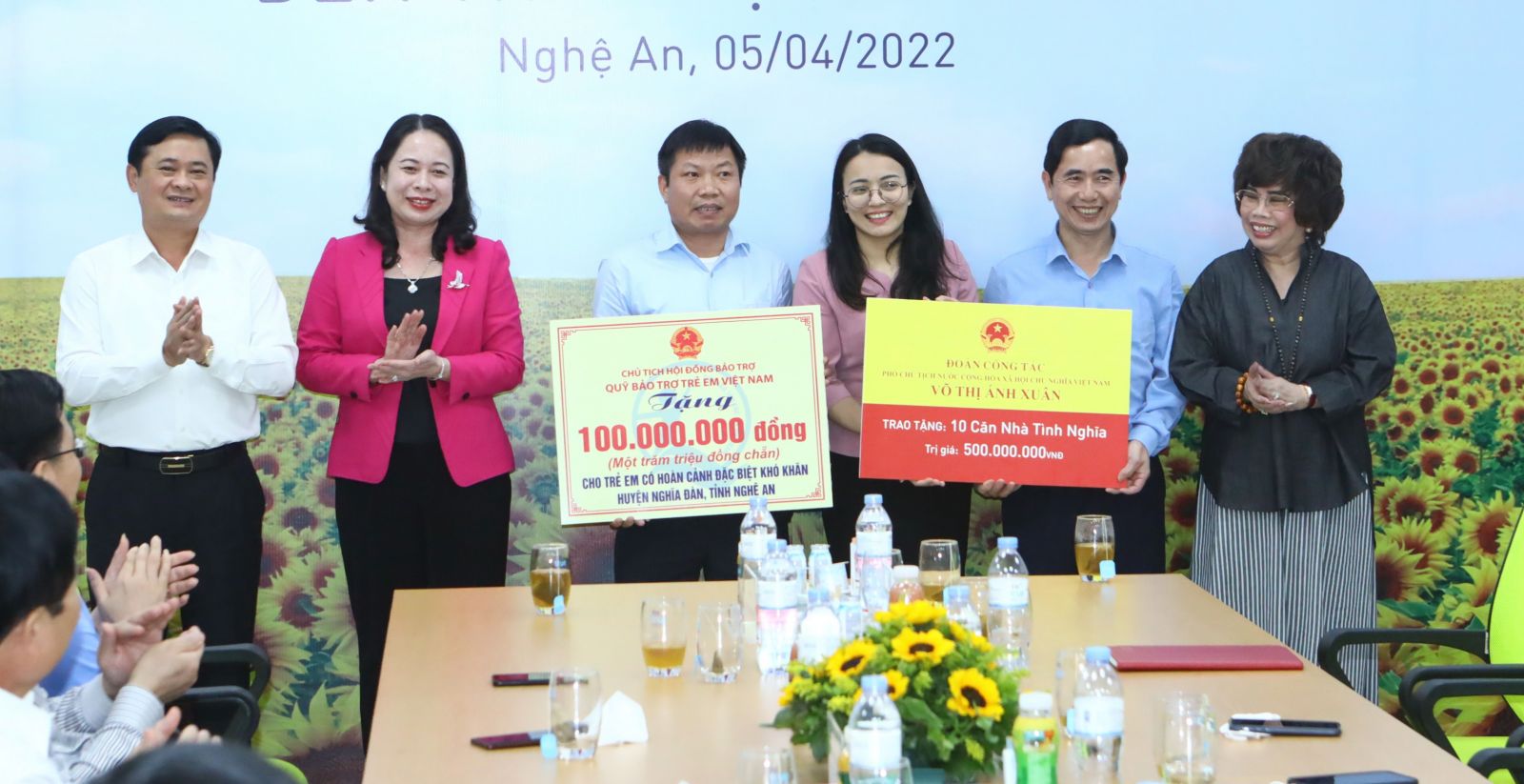 Đoàn công tác trao tặng huyện Nghĩa Đàn 10 căn nhà tình nghĩa và tặng trẻ em có hoàn cảnh khó khăn 100 triệu đồng. Ảnh: VPCTN