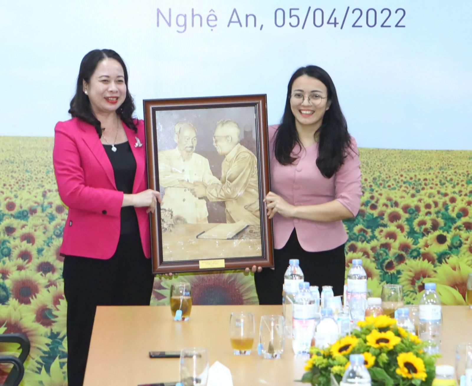 Phó Chủ tịch nước tặng tranh lưu niệm huyện Nghĩa Đàn. Ảnh: VPCTN