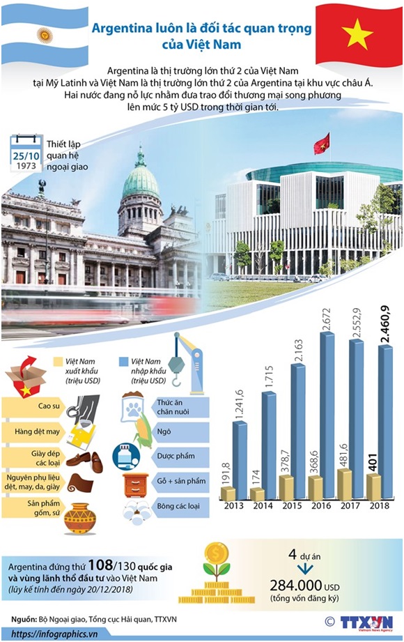 Ngày 25/10/1973, Argentina là một trong ba nước Mỹ Latinh (sau Cuba và Chile) thiết lập quan hệ ngoại giao với Việt Nam. 45 năm qua, quan hệ hữu nghị và hợp tác giữa hai nước không ngừng được củng cố và phát triển tốt đẹp.