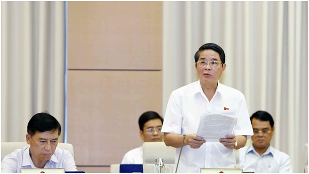 Chủ nhiệm Ủy ban Tài chính, Ngân sách của Quốc hội Nguyễn Đức Hải, Trưởng đoàn Giám sát của Uỷ ban Thường vụ Quốc hội trình bày báo cáo. (Ảnh: Văn Điệp/TTXVN)