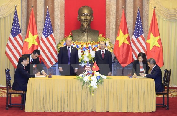 Chủ tịch nước Trần Đại Quang và Tổng thống Hoa Kỳ Donald Trump chứng kiến lễ ký các thỏa thuận hợp tác kinh tế quan trọng giữa hai nước, tổng trị giá hơn 12 tỷ USD. (Ảnh: Nhan Sáng/TTXVN)