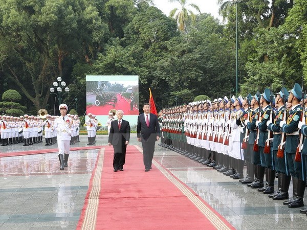 Đúng 16 giờ, đoàn xe chở Tổng Bí thư, Chủ tịch Trung Quốc Tập Cận Bình tiến vào Phủ Chủ tịch. Tổng Bí thư Nguyễn Phú Trọng nồng nhiệt chào đón và mời Tổng Bí thư, Chủ tịch Trung Quốc Tập Cận Bình bước lên bục danh dự.