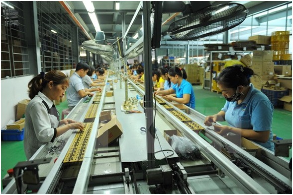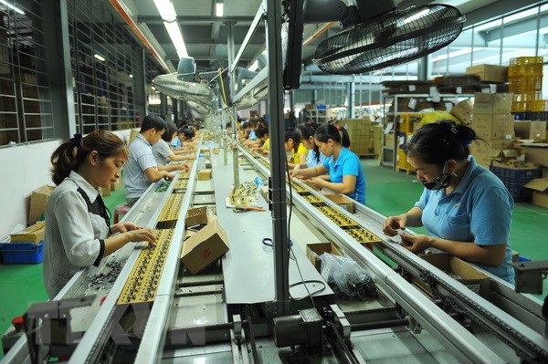 Công nhân của Công ty TNHH Đại Phát lắp ráp và sản xuất bóng đèn tiết kiệm điện. (Ảnh: Minh Đức/TTXVN)