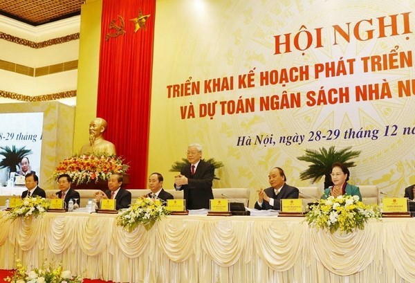 Tổng Bí thư Nguyễn Phú Trọng, Chủ tịch nước Trần Đại Quang, Thủ tướng Nguyễn Xuân Phúc, Chủ tịch Quốc hội Nguyễn Thị Kim Ngân dự hội nghị triển khai kế hoạch phát triển kinh tế-xã hội và dự toán ngân sách Nhà nước năm 2018. (Ảnh: Trí Dũng/TTXVN)