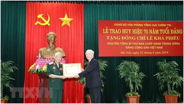 Thực hiện Quyết định của Thường vụ Quân ủy Trung ương về việc tặng Huy hiệu Đảng đợt 2/9/2019, sáng 25/8, tại Hà Nội, Đảng bộ Văn phòng Tổng cục Chính trị Quân đội nhân dân Việt Nam tổ chức Lễ trao Huy hiệu 70 năm tuổi Đảng tặng ông Lê Khả Phiêu, nguyên Tổng Bí thư Ban Chấp hành Trung ương Đảng Cộng sản Việt Nam, nguyên Chủ nhiệm Tổng cục Chính trị Quân đội nhân dân Việt Nam.