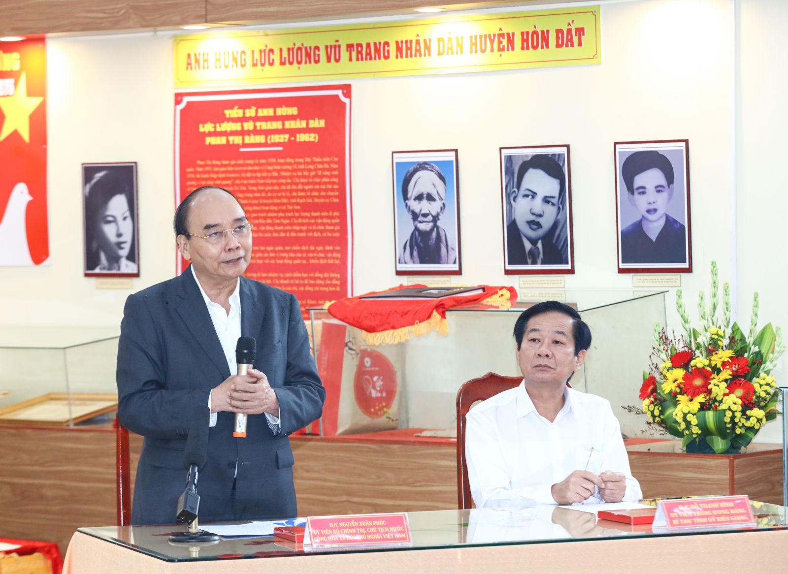 Chủ tịch nước Nguyễn Xuân Phúc dâng hương tưởng niệm nữ Anh hùng liệt sĩ Phan Thị Ràng (chị Sứ) và các anh hùng liệt sĩ huyện Hòn Đất tại Khu Di tích lịch sử thắng cảnh Ba Hòn. Ảnh: VPCTN