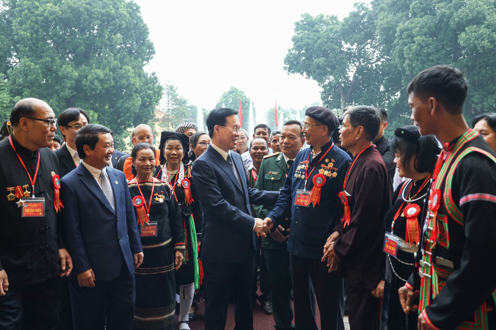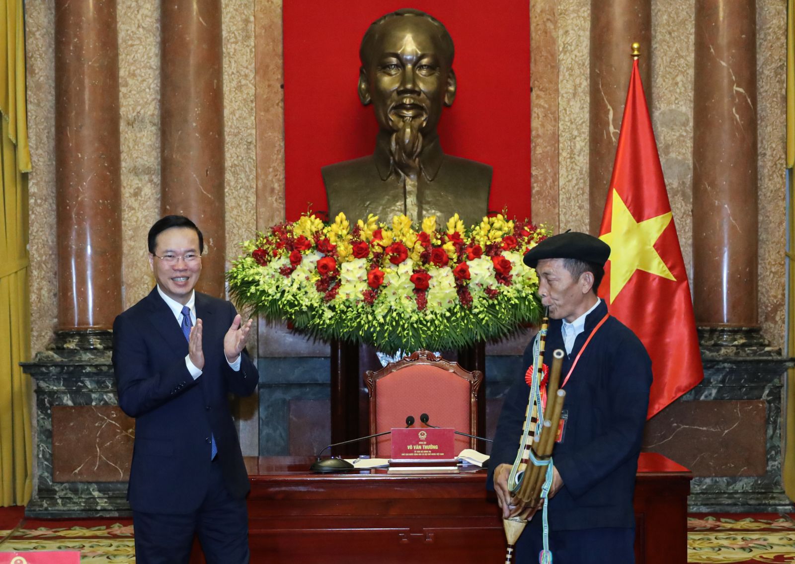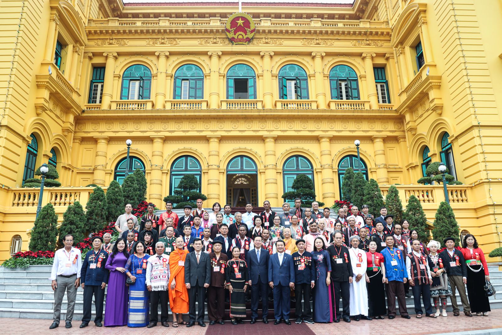 Hoan nghênh các điển hình tiên tiến là người có uy tín trong đồng bào dân tộc thiểu số, Chủ tịch nước Võ Văn Thưởng nhấn mạnh, xây dựng và phát huy sức mạnh đại đoàn kết toàn dân tộc là đường lối chiến lược của Đảng ta. Đảng, Nhà nước luôn quan tâm, ban hành nhiều chính sách chăm lo đồng bào các dân tộc; trong đó, có các chương trình mục tiêu quốc gia để nâng cao đời sống của đồng bào dân tộc thiểu số. Chủ tịch nước nhắc lại những đóng góp to lớn của đồng bào dân tộc thiểu số đối với sự nghiệp cách mạng vẻ vang của Đảng và toàn dân ta, cả trong giai đoạn đấu tranh giành độc lập, tự do, thống nhất đất nước trước đây cũng như xây dựng và phát triển đất nước ngày nay.