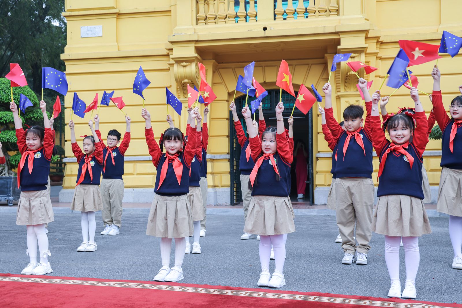 Các cháu thiếu nhi Thủ đô vẫy cờ Việt Nam và EU chào đón Chủ tịch Hội đồng châu Âu António Costa cùng đoàn cấp cao EU. Ảnh: VPCTN