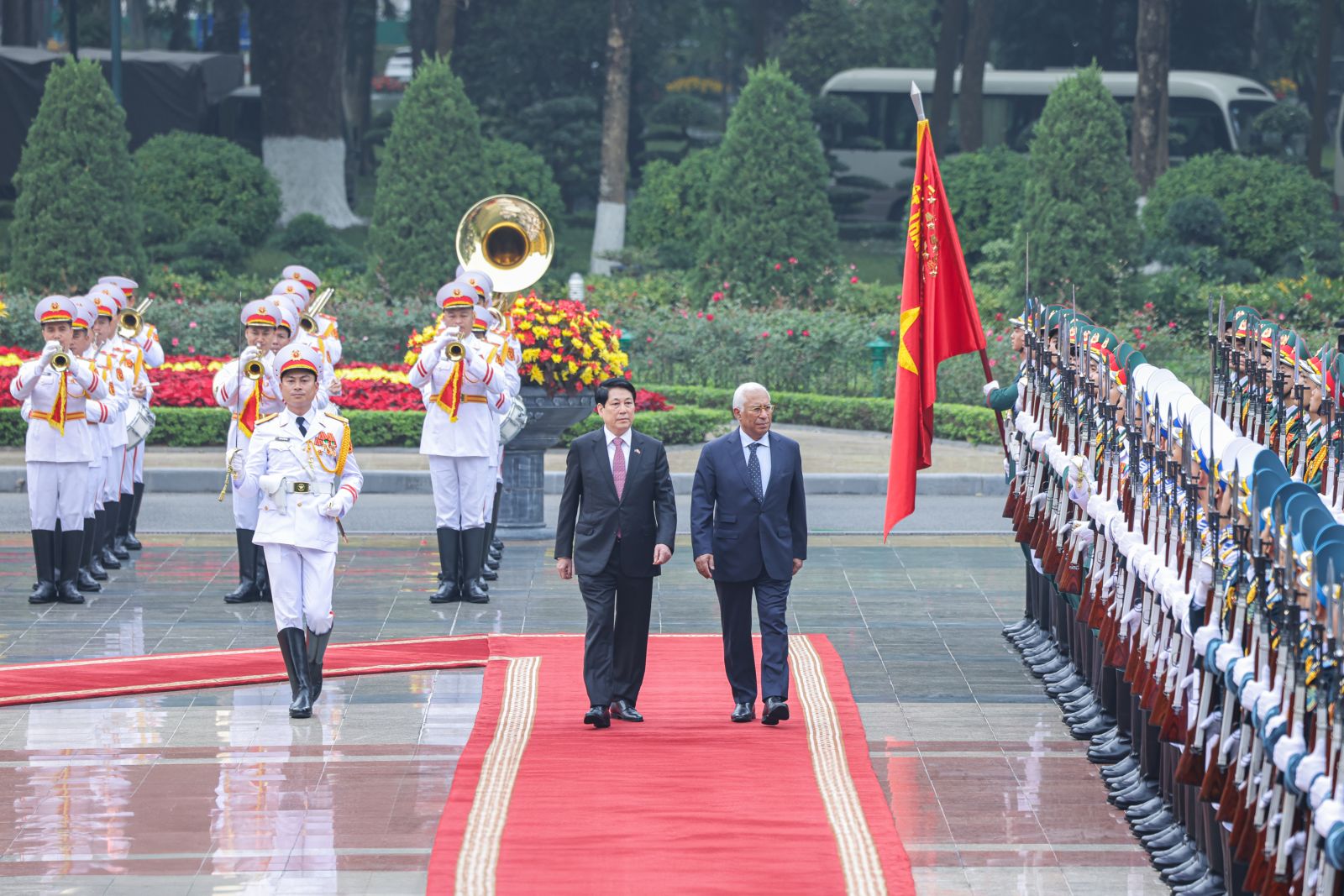 Chủ tịch nước Lương Cường và Chủ tịch Hội đồng châu Âu Antonio Costa trên bục danh dự, nghe Quân nhạc cử Quốc thiều Liên minh châu Âu và Việt Nam.