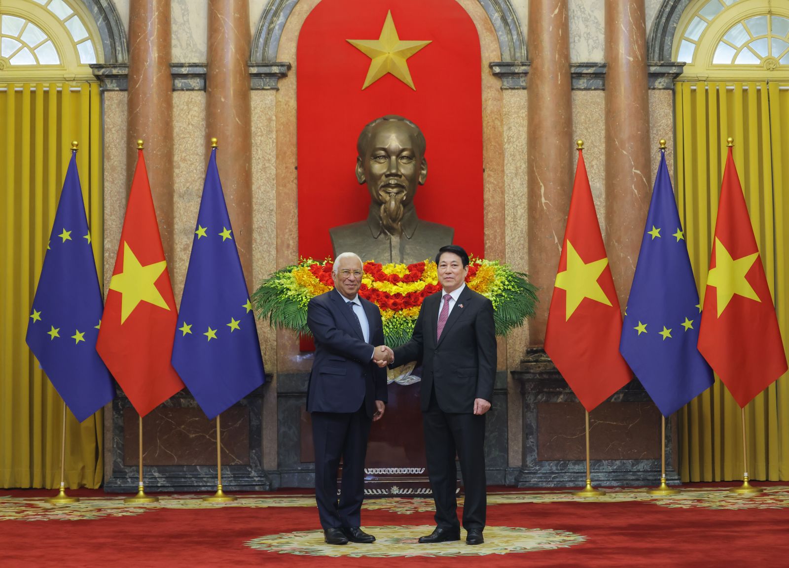 Đoàn xe hộ tống đưa Chủ tịch Hội đồng châu Âu António Costa tiến vào Phủ Chủ tịch, Chủ tịch nước Lương Cường có mặt tại thảm đỏ nồng nhiệt chào đón ông António Costa dẫn đầu Đoàn cấp cao EU thăm chính thức Việt Nam. Đại diện thiếu nhi thủ đô tiến tới trao tặng Chủ tịch Hội đồng châu Âu bó hoa tươi thắm.