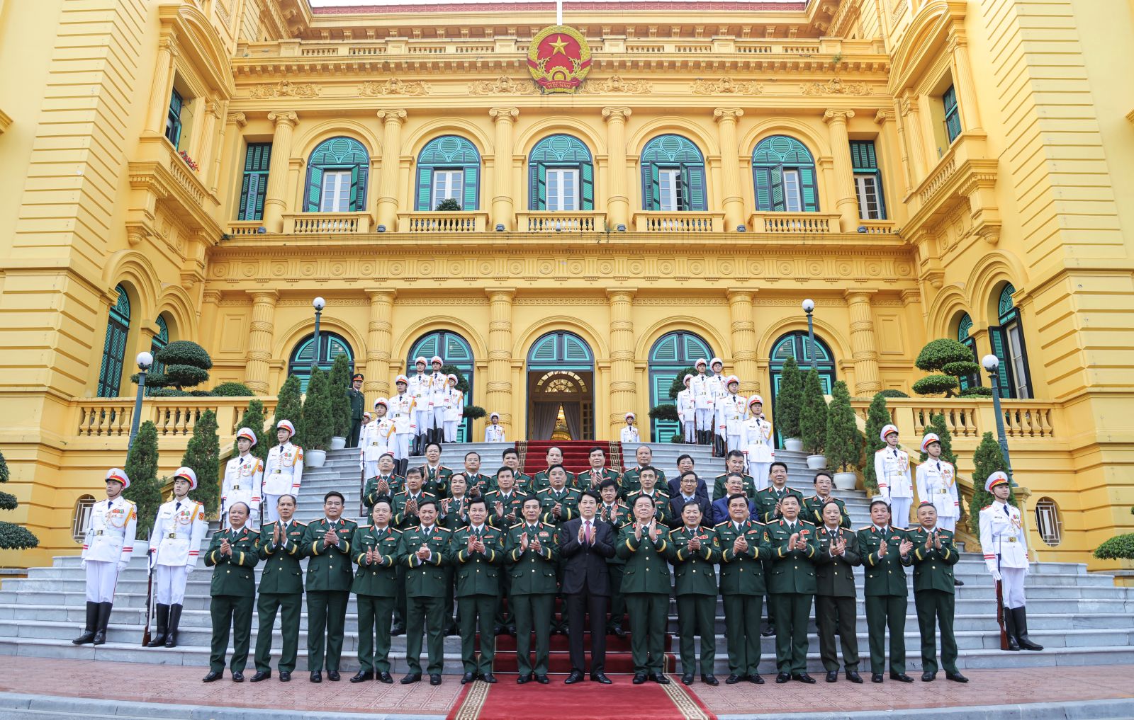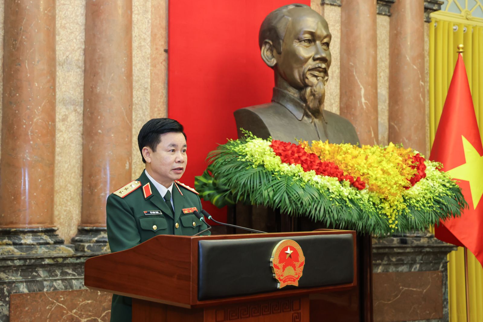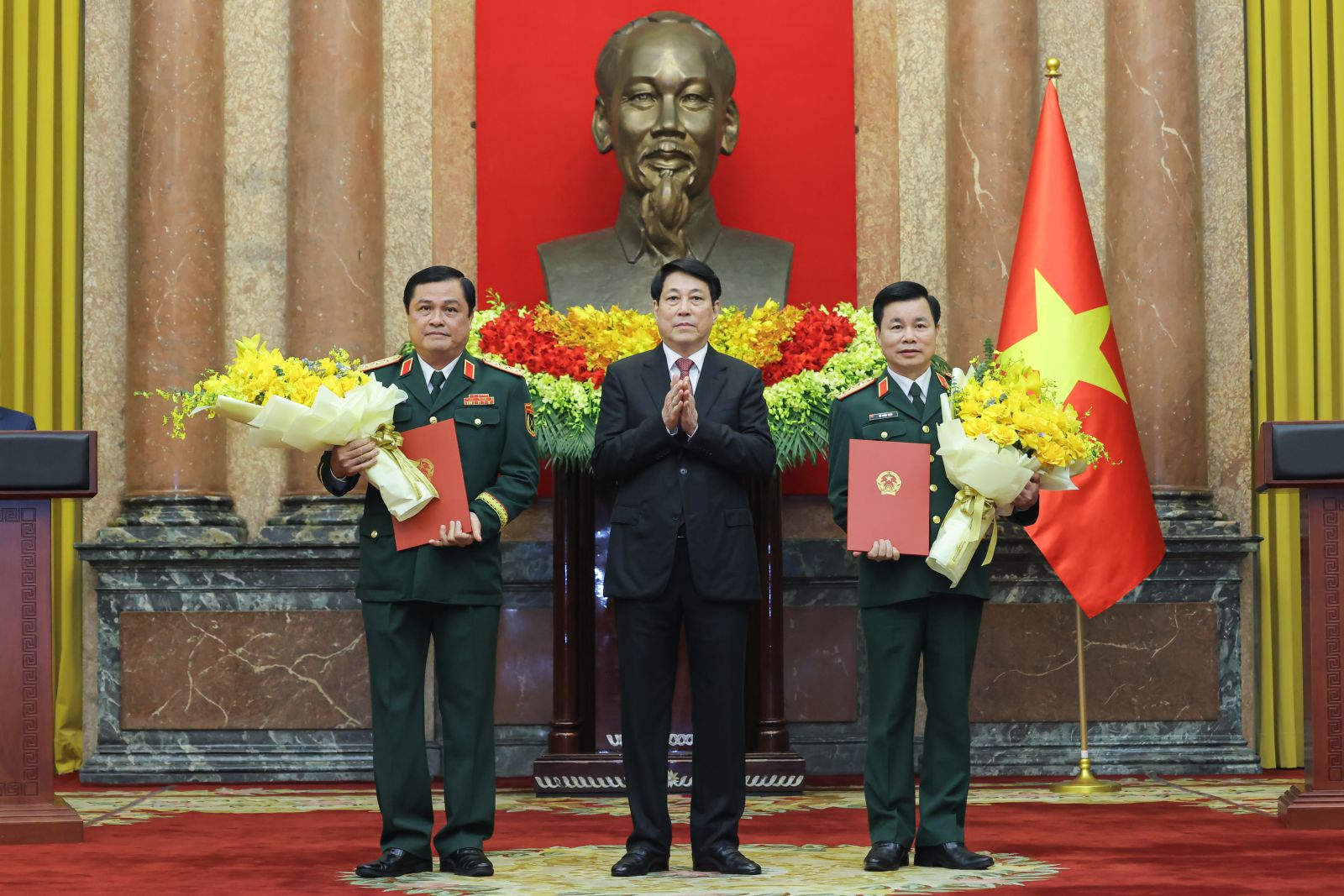 Trong bối cảnh đó, Chủ tịch nước yêu cầu hai đồng chí vừa được thăng quân hàm tiếp tục phát huy truyền thống vẻ vang của Quân đội nhân dân Anh hùng; giữ gìn phẩm chất đạo đức cách mạng; đoàn kết, gắn bó máu thịt với cán bộ, chiến sĩ và nhân dân; học tập, tu dưỡng, rèn luyện để luôn xứng đáng với đạo làm Tướng như Bác Hồ kính yêu đã dạy và là người lãnh đạo, chỉ huy tài năng, mẫu mực, nỗ lực phấn đấu, khắc phục khó khăn, thử thách, hoàn thành xuất sắc mọi nhiệm vụ mà Đảng, Nhà nước và nhân dân tin tưởng giao phó.