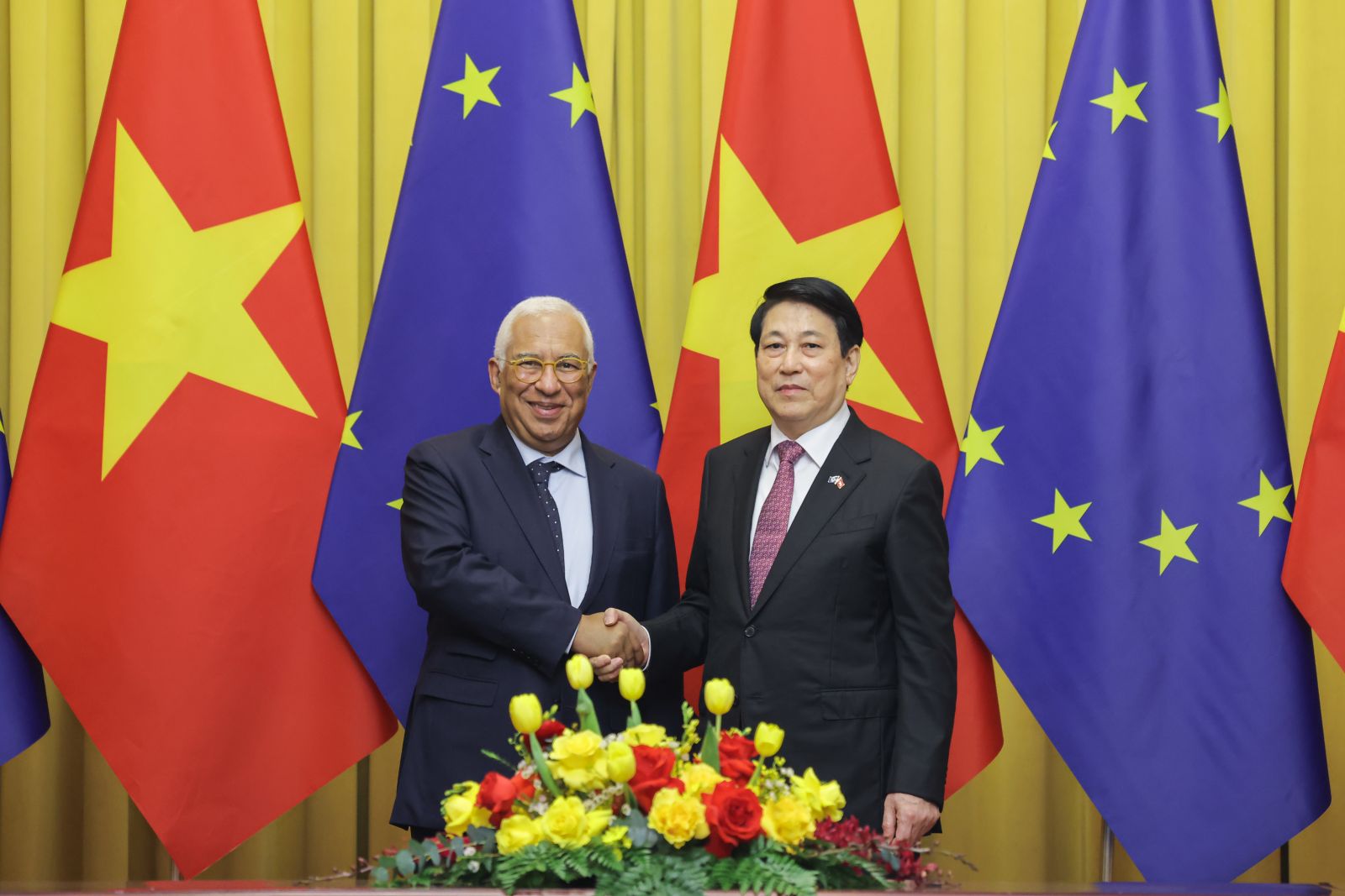 Bày tỏ vinh dự là vị khách châu Âu đầu tiên thăm Việt Nam ngay sau Đại hội Đảng lần thứ XIV, Chủ tịch Hội đồng châu Âu Antonio Costa cảm ơn sự đón tiếp trọng thị, nồng hậu của Nhà nước Việt Nam và Chủ tịch nước Lương Cường; nhiệt liệt chúc mừng thành công của Đại hội Đảng toàn quốc lần thứ XIV; bày tỏ ấn tượng sâu sắc trước những thành tựu phát triển kinh tế-xã hội to lớn, toàn diện mà Việt Nam đạt được sau 40 năm Đổi mới.