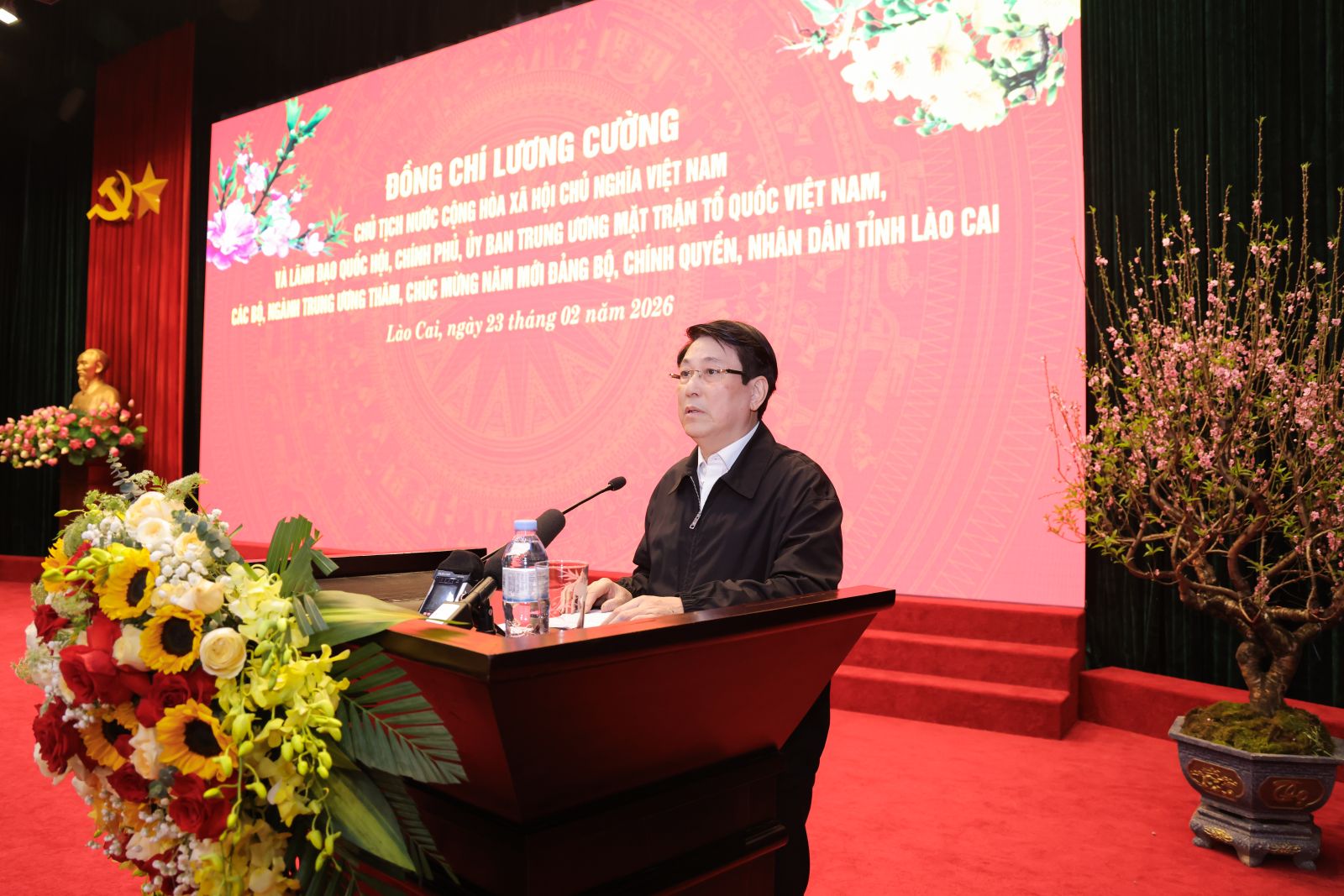 Phát biểu tại buổi gặp mặt, Chủ tịch nước gửi lời chúc mừng năm mới tới toàn thể cán bộ, đảng viên, đồng bào và chiến sĩ lực lượng vũ trang tỉnh Lào Cai; đồng thời biểu dương những kết quả nổi bật mà Đảng bộ, chính quyền và nhân dân các dân tộc trong tỉnh đạt được thời gian qua.
