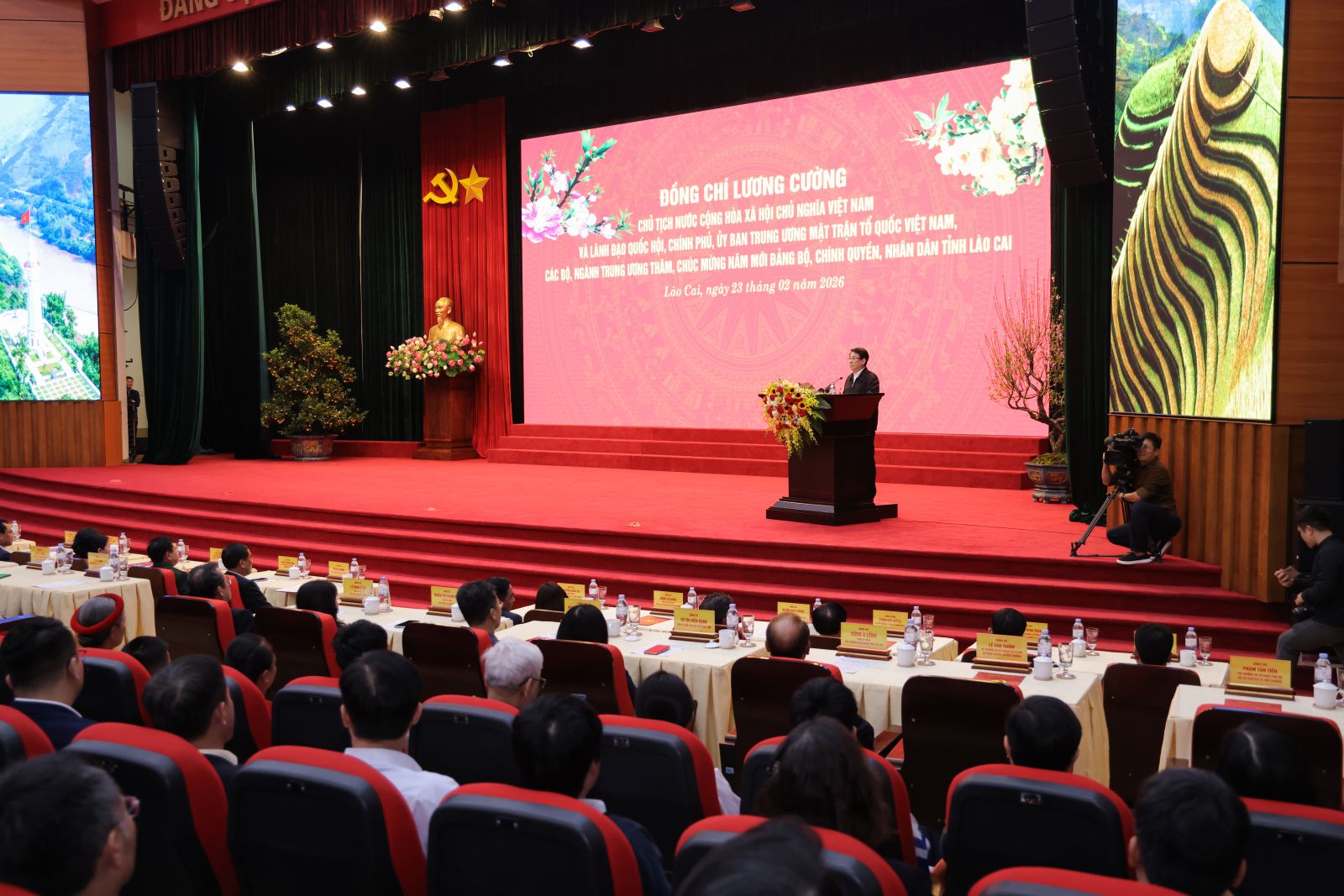 Chủ tịch nước Lương Cường chúc Tết Đảng bộ, chính quyền, Nhân dân các dân tộc, lực lượng vũ trang tỉnh Lào Cai. Ảnh: VPCTN