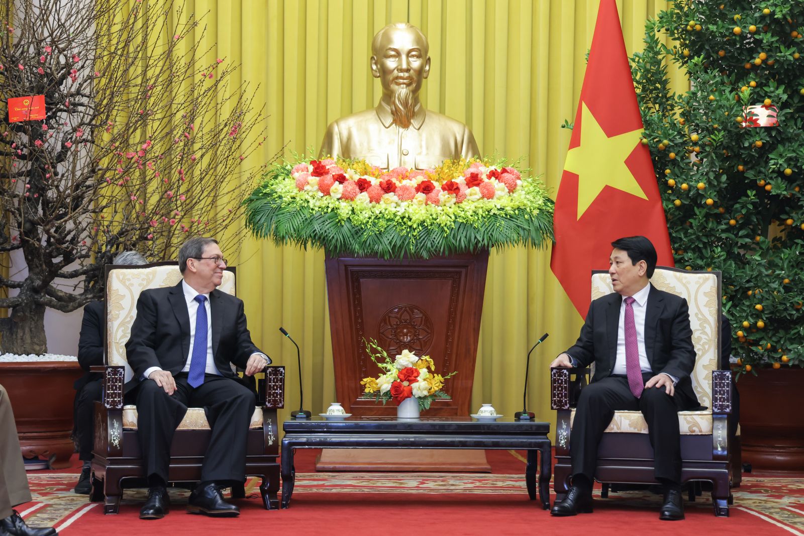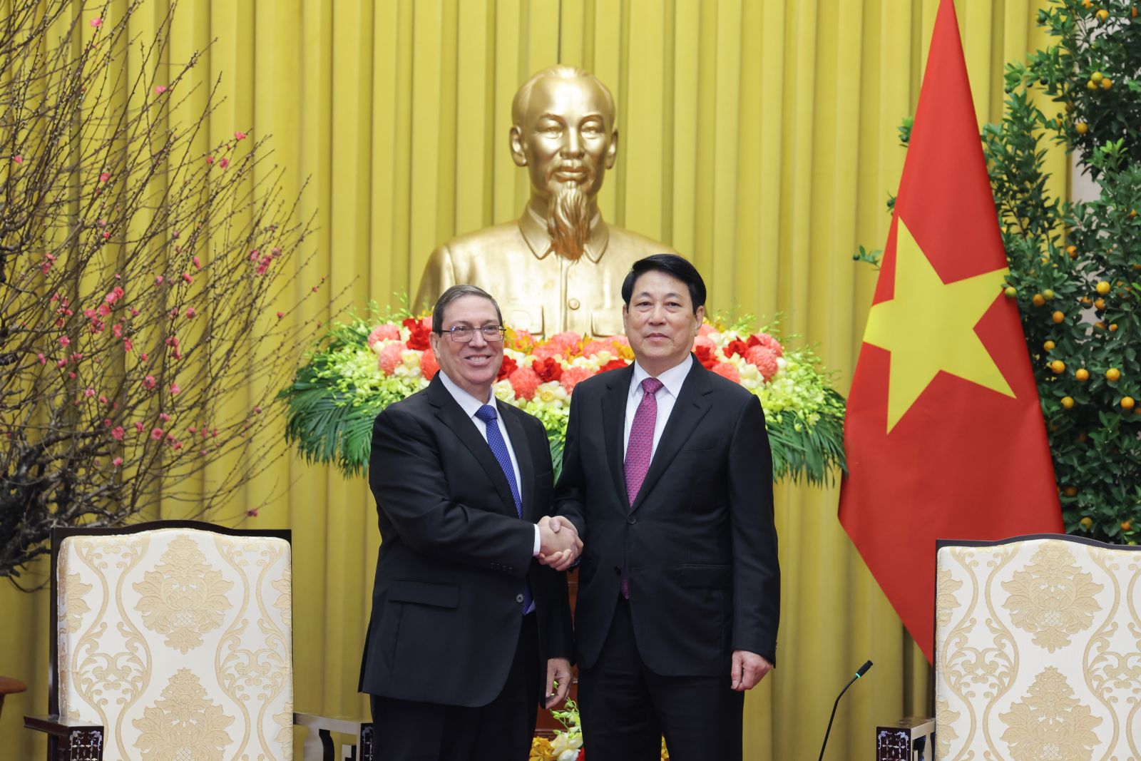 Chủ tịch nước Lương Cường tiếp Đặc phái viên Đảng Cộng sản Cuba, Nhà nước Cộng hòa Cuba, Ủy viên Bộ Chính trị, Bộ trưởng Ngoại giao Cuba Bruno Rodríguez Parrilla. Ảnh: VPCTN