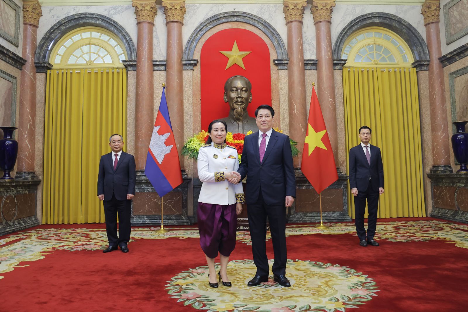 Khẳng định Việt Nam và Campuchia là hai nước láng giềng gần gũi, có truyền thống đoàn kết, gắn bó, Chủ tịch nước nhấn mạnh gần 60 năm qua kể từ khi thiết lập quan hệ ngoại giao (24/6/1967), hai nước luôn kề vai sát cánh, hỗ trợ lẫn nhau trong quá trình đấu tranh vì độc lập dân tộc trước đây, cũng như công cuộc xây dựng và phát triển mỗi nước ngày nay.