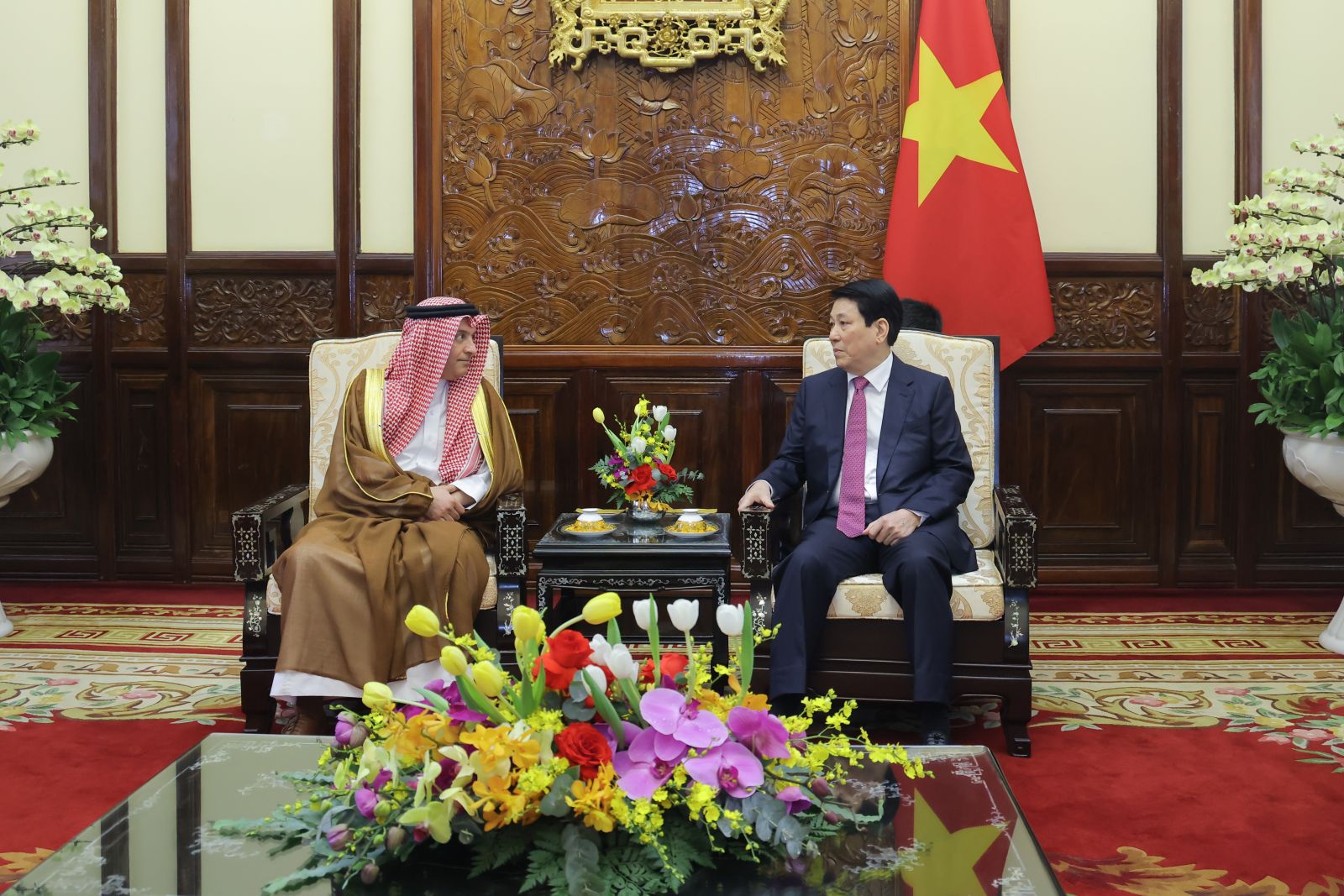 Chủ tịch nước khẳng định Việt Nam đánh giá cao vai trò, vị thế của Saudi Arabia tại khu vực, đặc biệt trong thế giới Arab và Hồi giáo; chúc mừng các thành tựu phát triển của Saudi Arabia trong quá trình hiện thực hóa các mục tiêu tại Tầm nhìn 2030 và tin tưởng rằng Hoàng gia, Chính phủ, nhân dân Saudi Arabia sẽ tiếp tục giành được nhiều thắng lợi hơn nữa trong sự nghiệp xây dựng, phát triển đất nước.