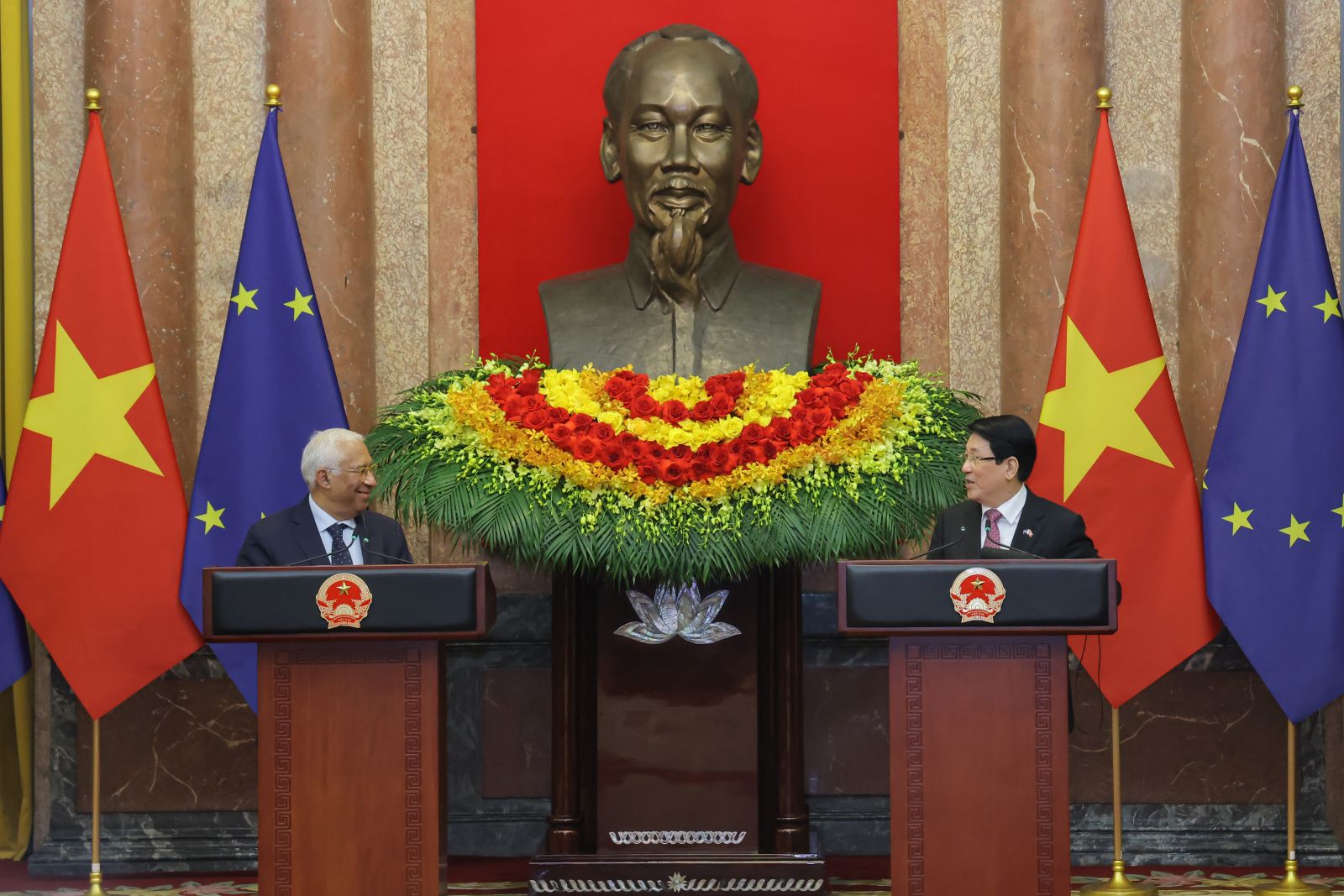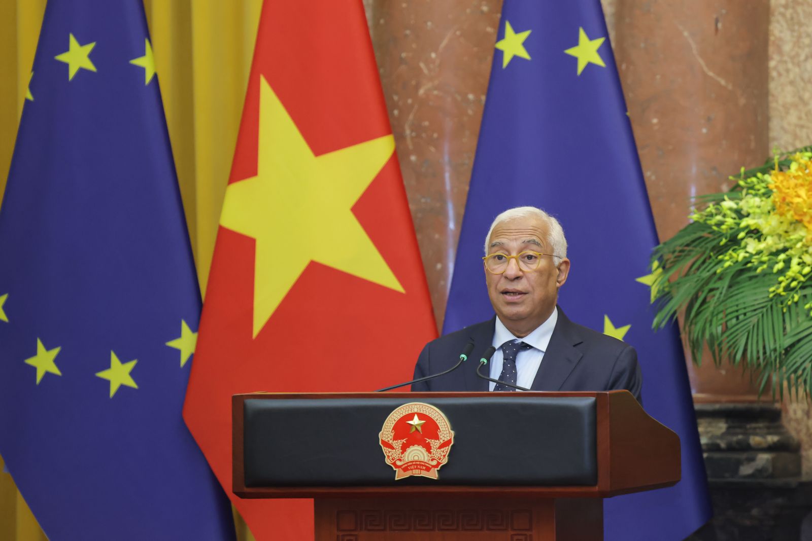 Về phần mình, bày tỏ vinh dự tới thăm Việt Nam, Chủ tịch Hội đồng châu Âu Antonio Costa chúc mừng Việt Nam vừa tổ chức thành công Đại hội Đảng toàn quốc lần thứ XIV; khẳng định EU cam kết tăng cường và làm sâu sắc hơn nữa quan hệ đối tác với Việt Nam trên cơ sở tôn trọng lẫn nhau và chia sẻ các mục tiêu chung.