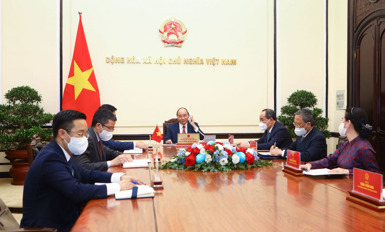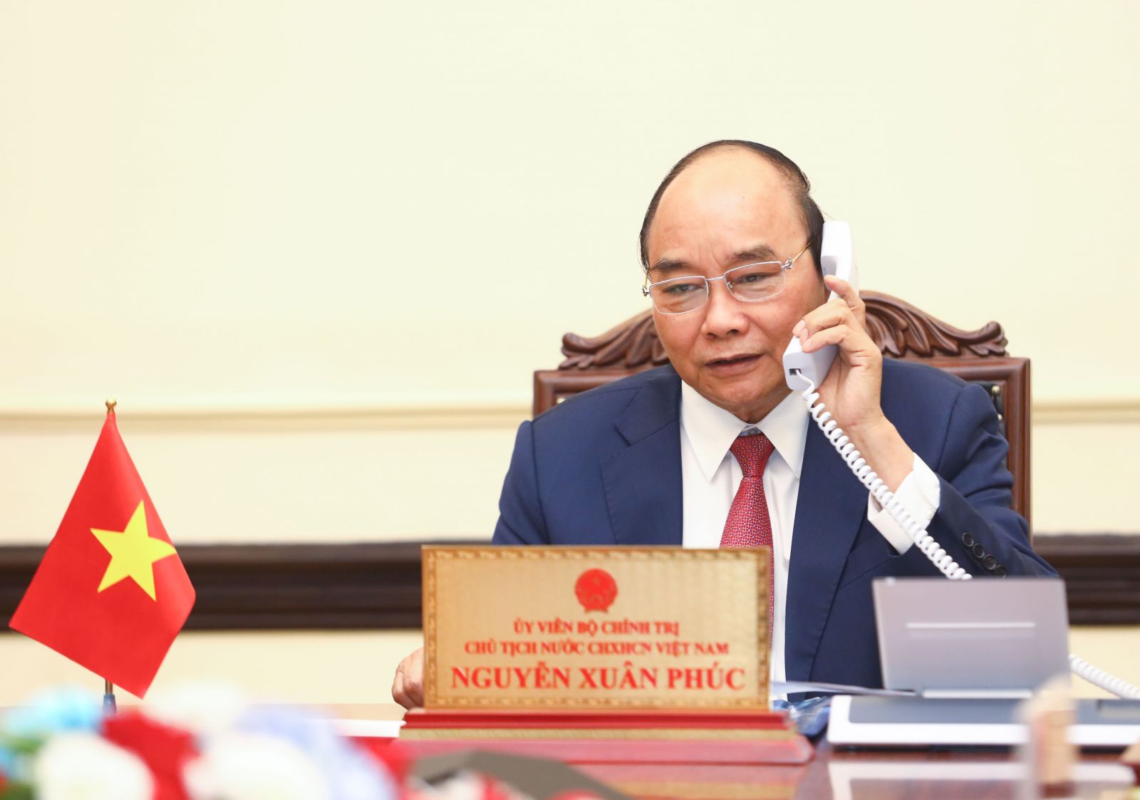 Chủ tịch nước Nguyễn Xuân Phúc điện đàm với Tổng thống đắc cử Hàn Quốc. Ảnh: VPCTN