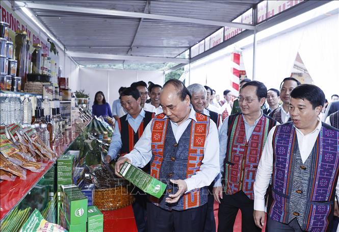Chủ tịch nước Nguyễn Xuân Phúc xem các sản phẩm Ocop của tỉnh Lai Châu
