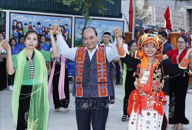Chủ tịch nước Nguyễn Xuân Phúc và nhân dân tỉnh Lai Châu múa điệu "Xoè Thái"