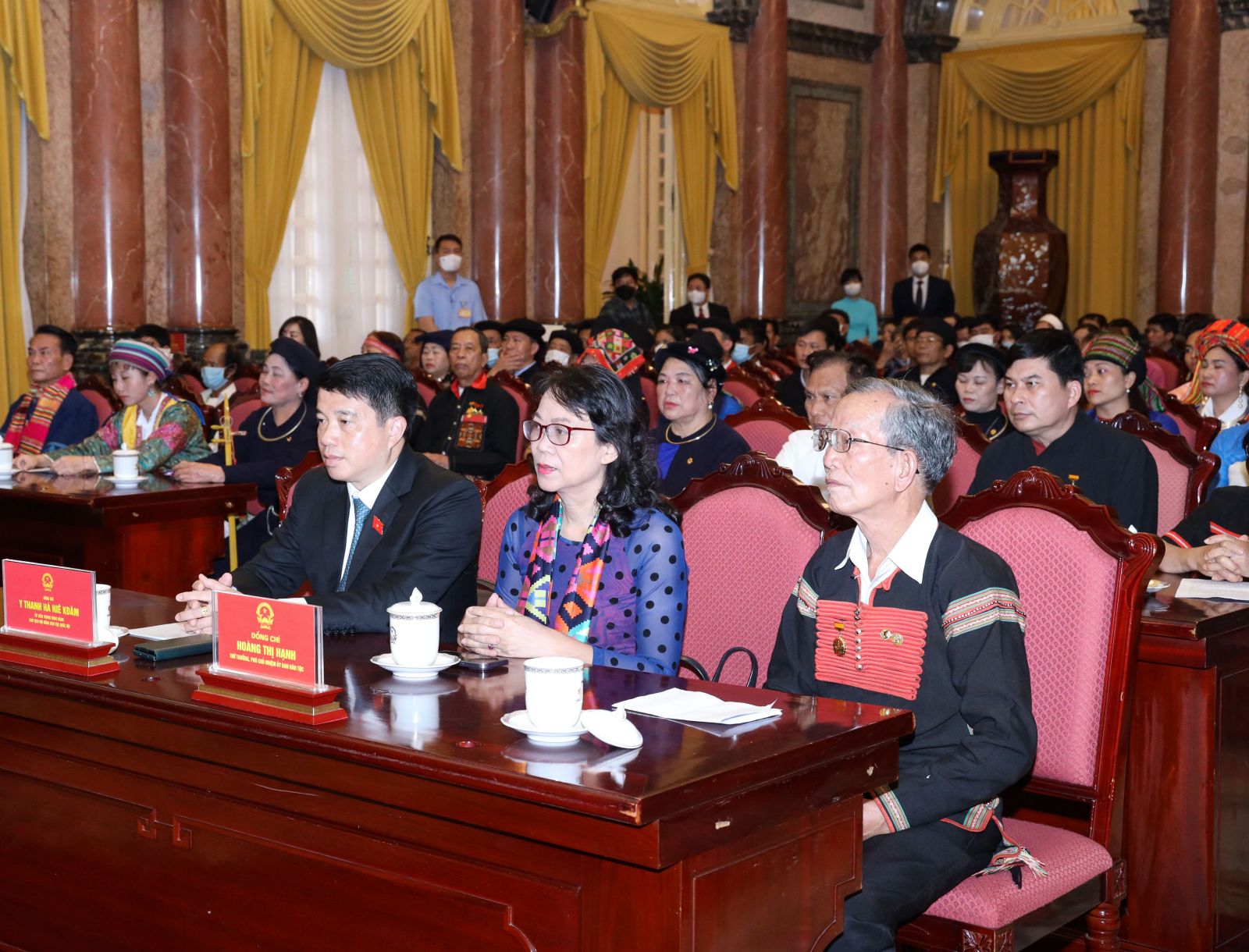 Chủ tịch nước mong muốn già làng, trưởng bản, nghệ nhân, người có uy tín tiêu biểu trong đồng bào tiếp tục nêu gương sáng cho con cháu và cộng đồng; là nhân tố tích cực trong các phong trào của địa phương, tiếp tục vận động đồng bào phát huy truyền thống văn hóa tốt đẹp, tự lực tự cường, đoàn kết dân tộc, nhất là trong bối cảnh đất nước hội nhập sâu rộng. Tích cực bảo tồn, phát huy văn hóa, nghệ thuật và một số loại hình nghệ thuật truyền thống dân tộc; trao truyền các giá trị văn hoá vật thể và phi vật thể; đặc biệt quan tâm giáo dục các thế hệ trẻ bởi theo Chủ tịch nước, thông qua sự kết nối của văn hóa, chúng ta sẽ dễ dàng gần gũi, hiểu biết và yêu thương lẫn nhau, góp phần vun đắp sức mạnh Việt Nam, giá trị Việt Nam cho hôm nay và mai sau.