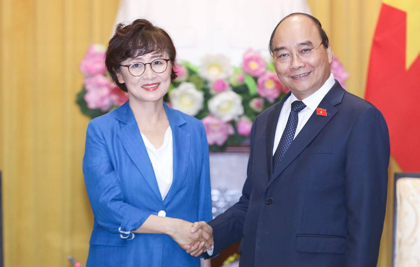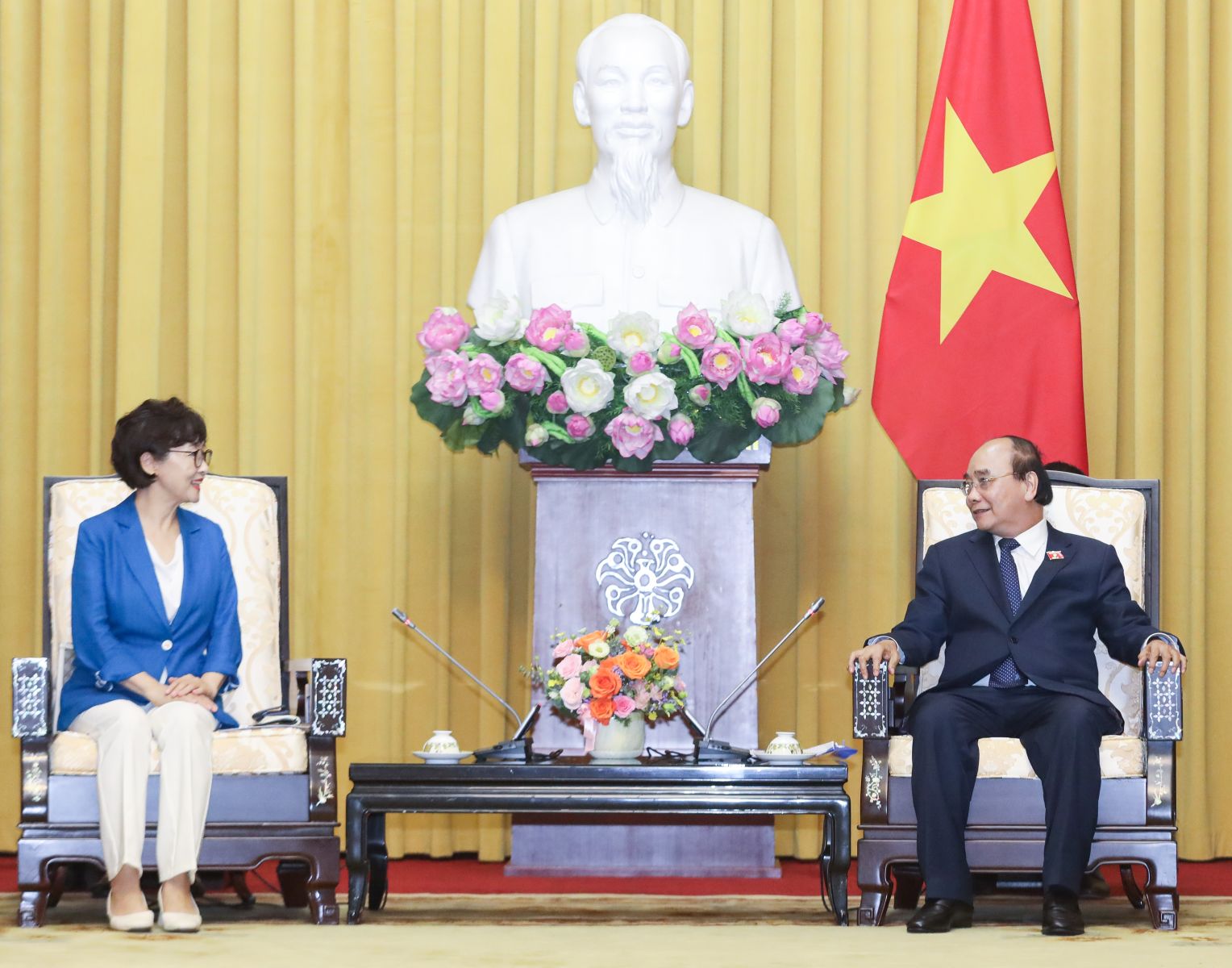Chủ tịch nước Nguyễn Xuân Phúc tiếp Chủ tịch Liên hiệp Hội người Hàn Quốc tại Việt Nam Chang Eun Sook. Ảnh: VPCTN