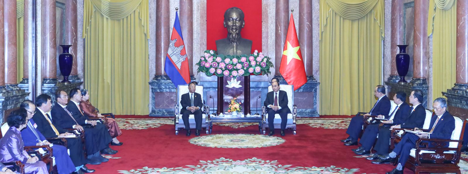 Thay mặt Đoàn đại biểu cấp cao Quốc hội Campuchia, Samdech Chủ tịch Quốc hội Vương quốc Campuchia bày tỏ vui mừng gặp lại Chủ tịch nước Nguyễn Xuân Phúc và đánh giá cao những thành quả phát triển kinh tế - xã hội của Việt Nam. Chủ tịch Quốc hội Campuchia cũng nhấn mạnh, Quốc hội Campuchia luôn sát cánh bên Việt Nam với tinh thần đoàn kết hữu nghị tốt đẹp giữa hai nước. Năm 2022 kỷ niệm 55 năm thiết lập quan hệ ngoại giao giữa hai nước (1967 - 2022), Chủ tịch Quốc hội Vương quốc Campuchia mong muốn cơ quan chức năng hai nước tổ chức nhiều hoạt động thiết thực, vun đắp cho sự phát triển tốt đẹp của mối quan hệ hữu nghị truyền thống giữa hai dân tộc. Samdech Chủ tịch khẳng định nhiều thập kỷ qua quan hệ hữu nghị và hợp tác song phương giữa hai nước ngày càng được củng cố và phát triển trên các lĩnh vực từ văn hóa, giáo dục, kinh tế xã hội, giao lưu nhân dân.