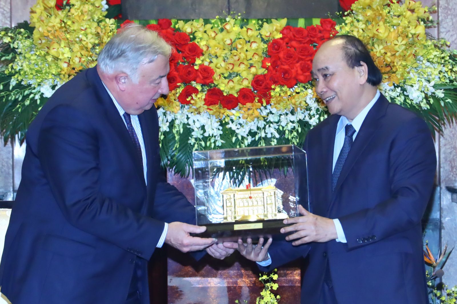 Chủ tịch nước Nguyễn Xuân Phúc tặng quà lưu niệm cho Chủ tịch Thượng viện Pháp Gérard Larcher. Ảnh: VPCTN